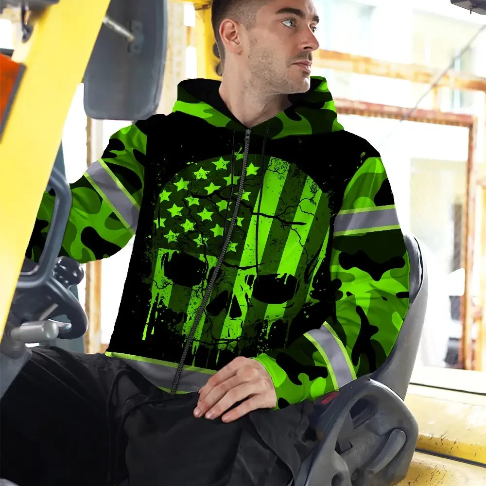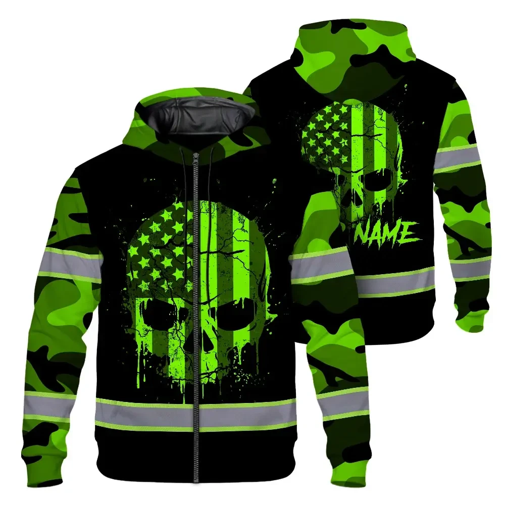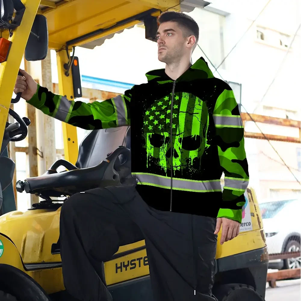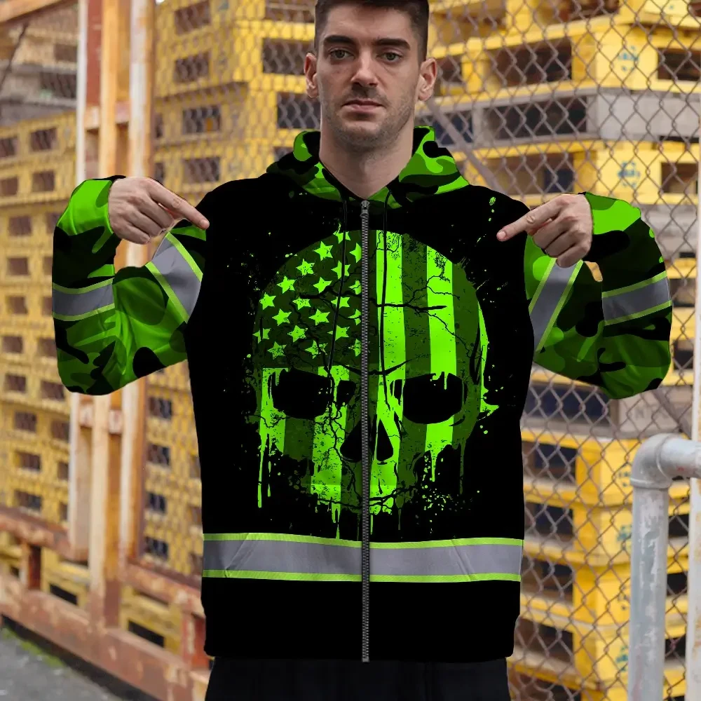 Hi Vis Zip Hoodie Reflective Tapes Skull Camo USA Flag Custom Name Safety Workwear