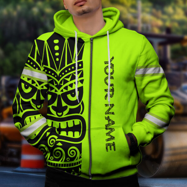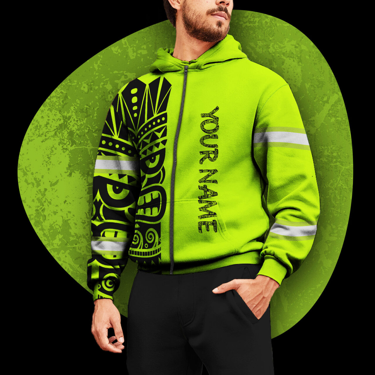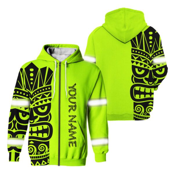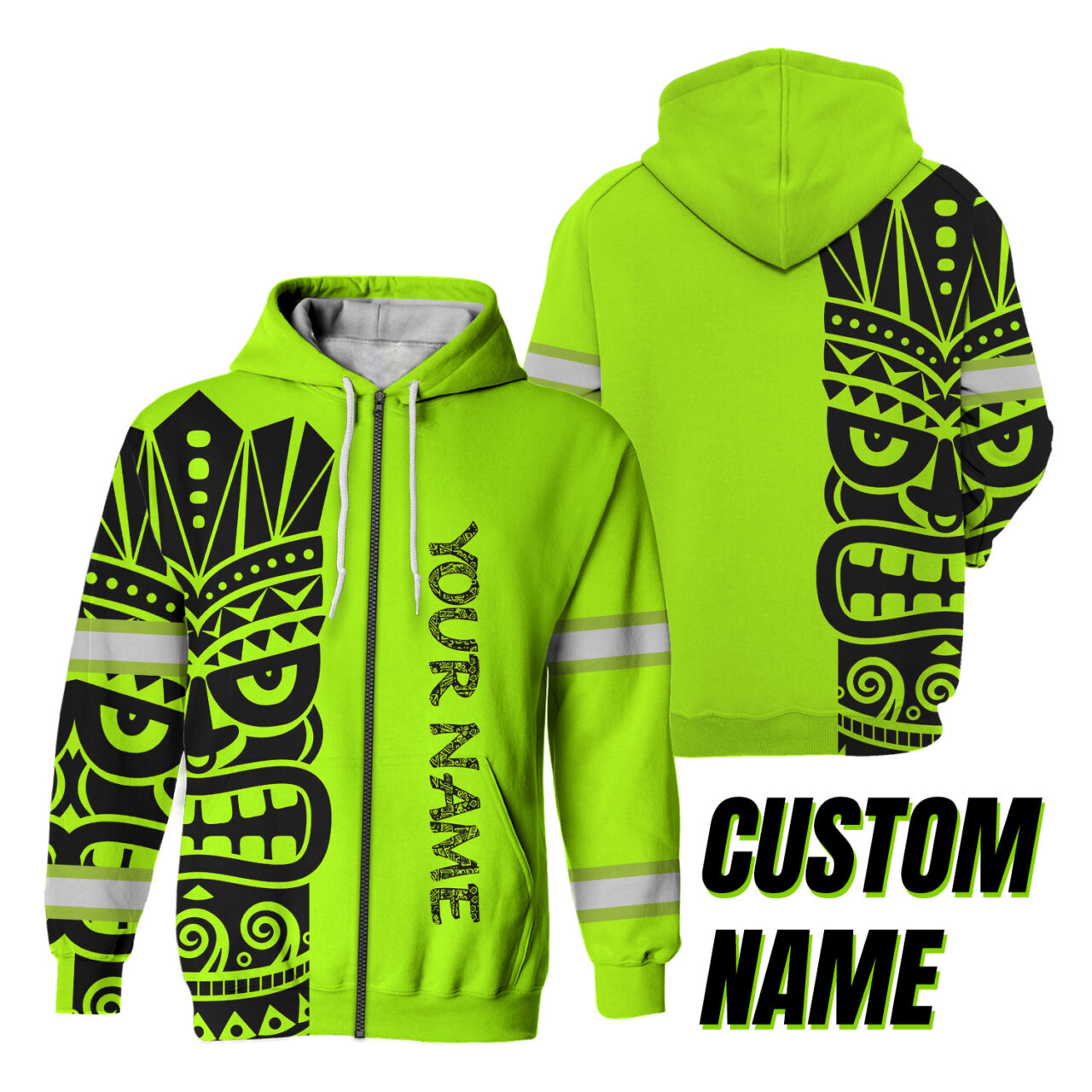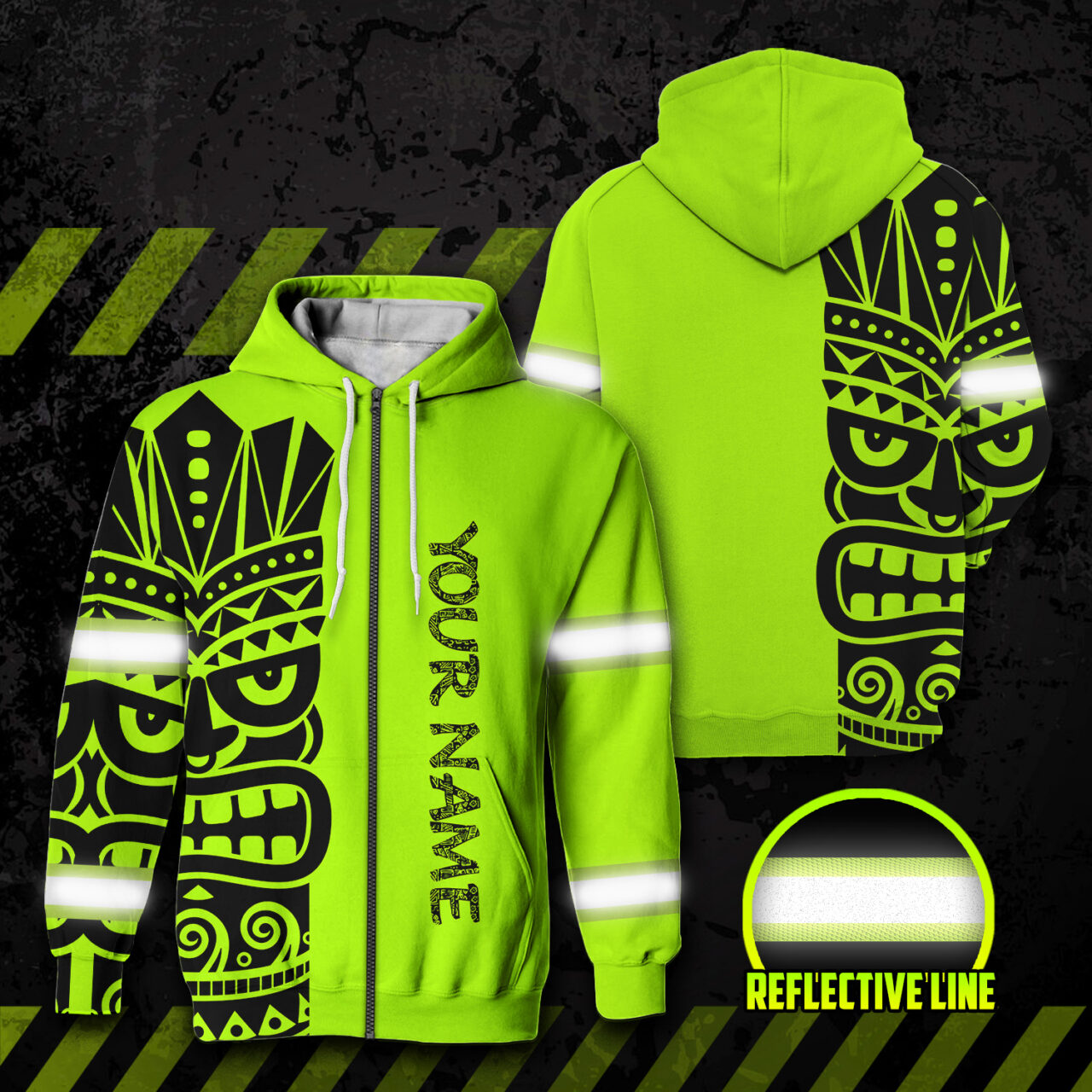 Hi Vis Zip Hoodie Reflective Tapes TiKi Hawaiian Polynesian Tribal Custom Name Safety Workwear For Workers, Runners, Cyclists