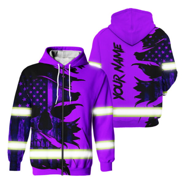 Hi Vis Zip Hoodie Reflective Tapes Violet Neon Skull US Flag Scratch Custom Name Safety Workwear For Workers, Runners, Cyclists, Patriotic