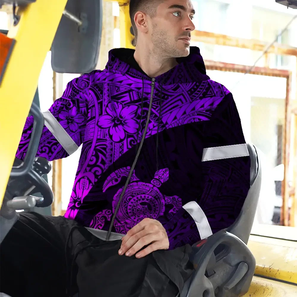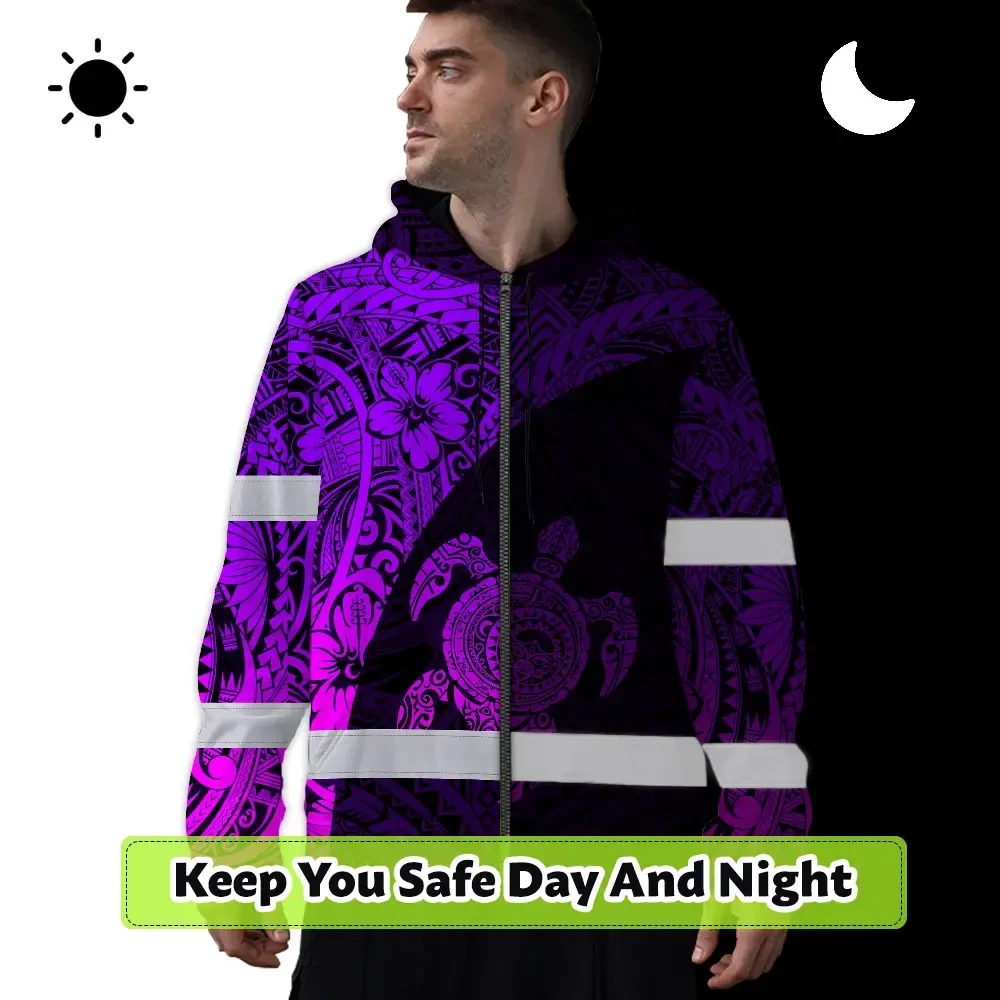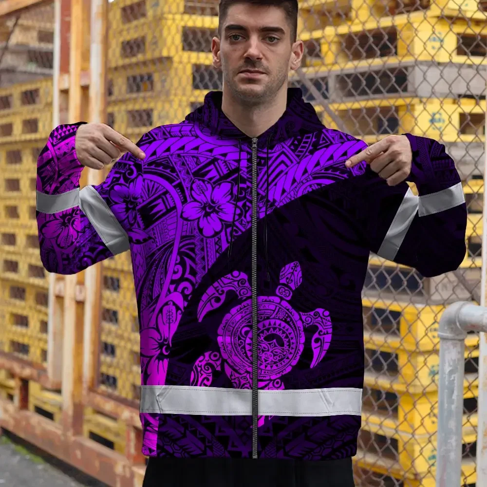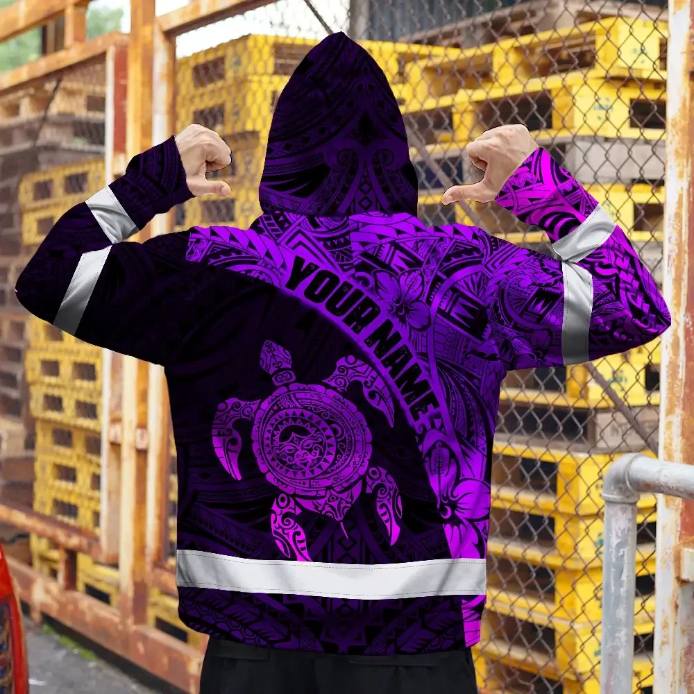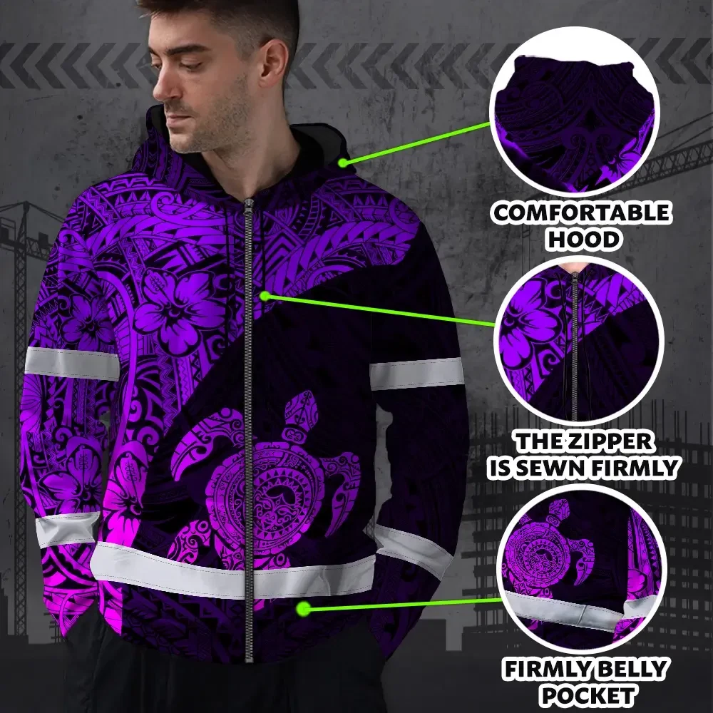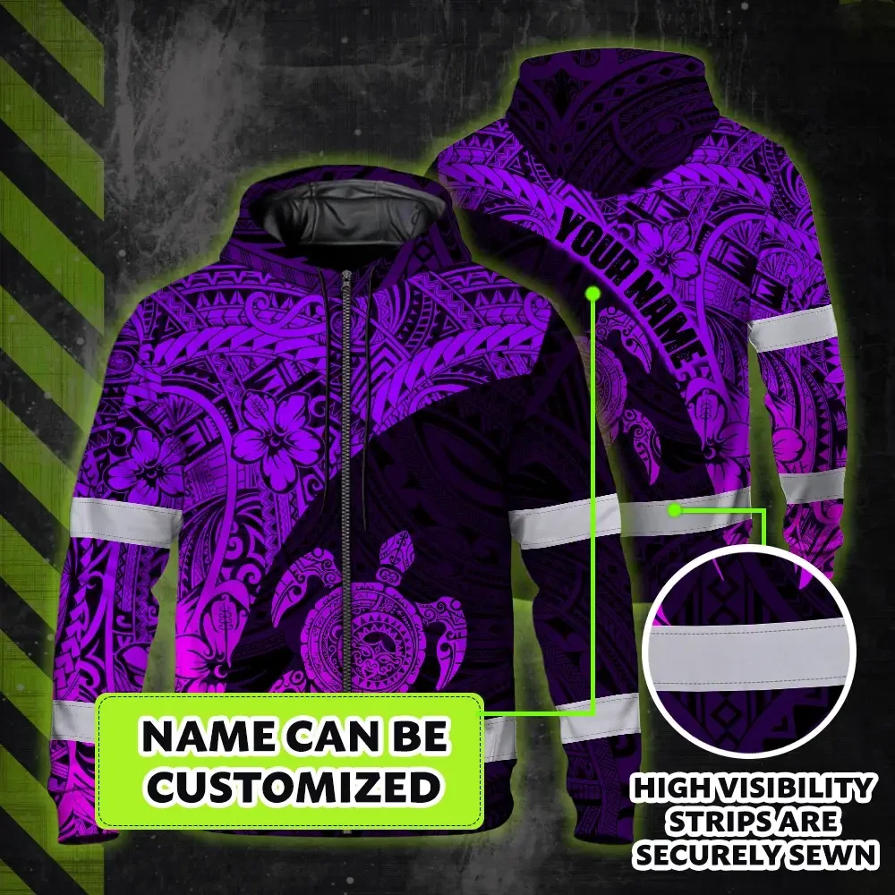 Hi Vis Zip Hoodie Reflective Tapes Violet Neon Turtle Hawaiian Polynesian Tribal Custom Name Safety Workwear For Workers, Truckers, Operators