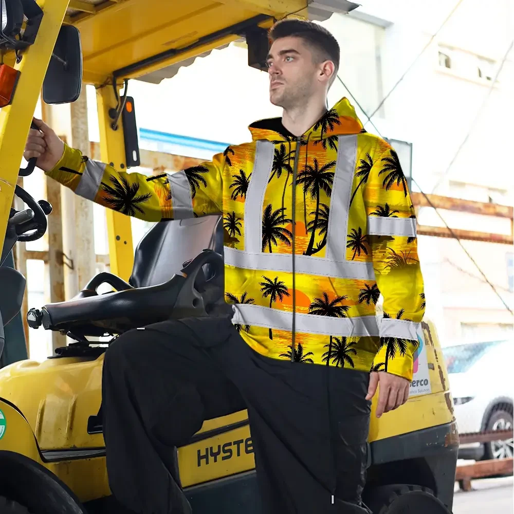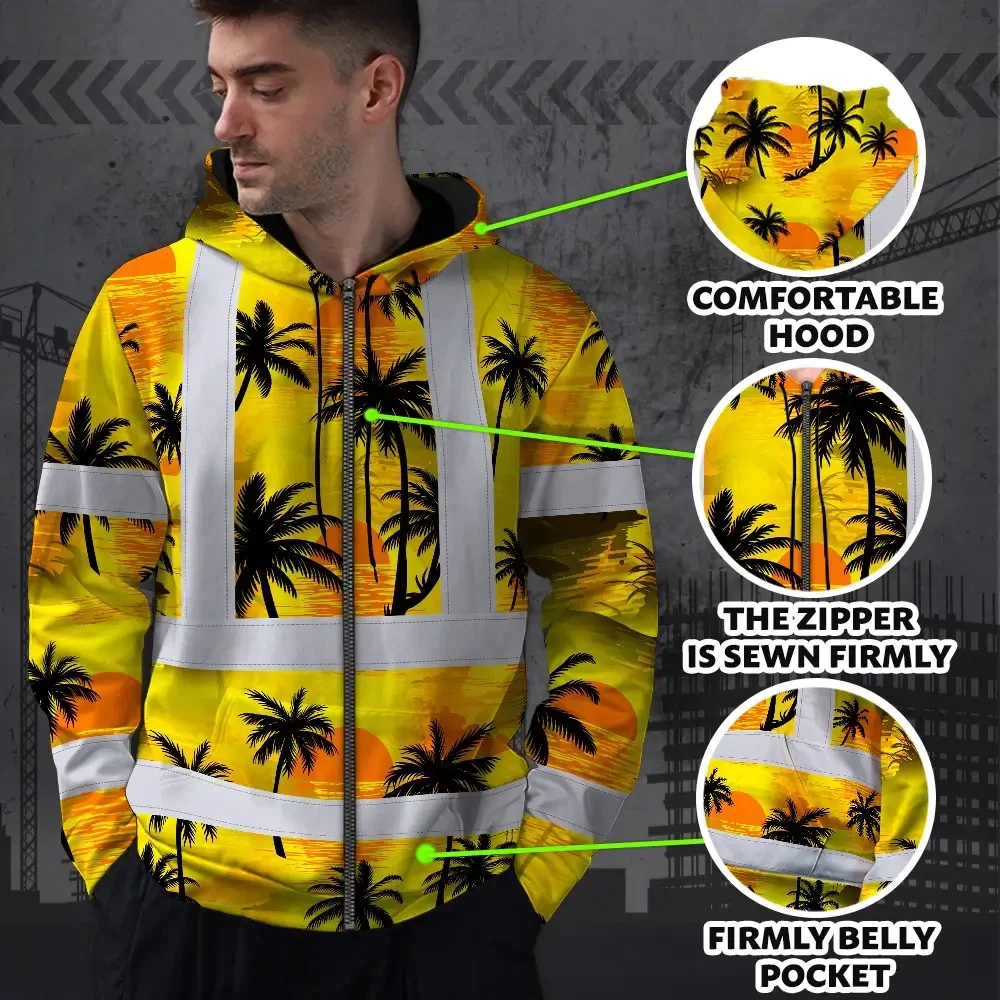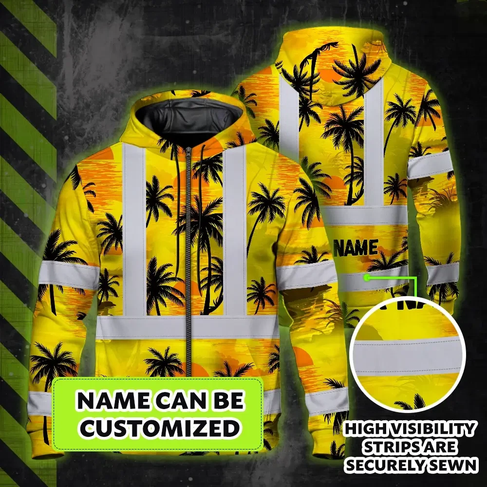 Hi Vis Zip Hoodie Reflective Tapes Yellow Neon Flowers Custom Name Safety Workwear For Workers, Truckers, Operators