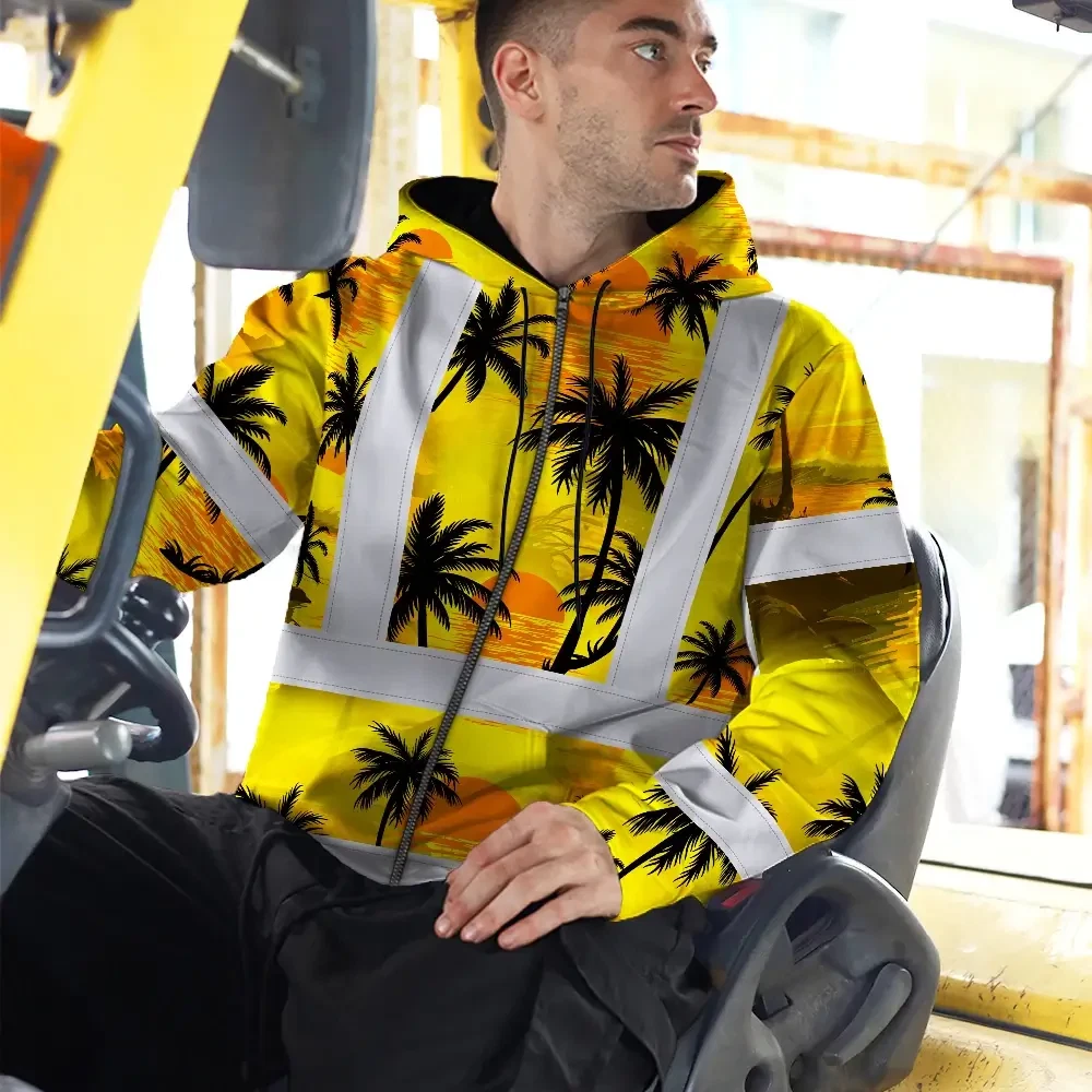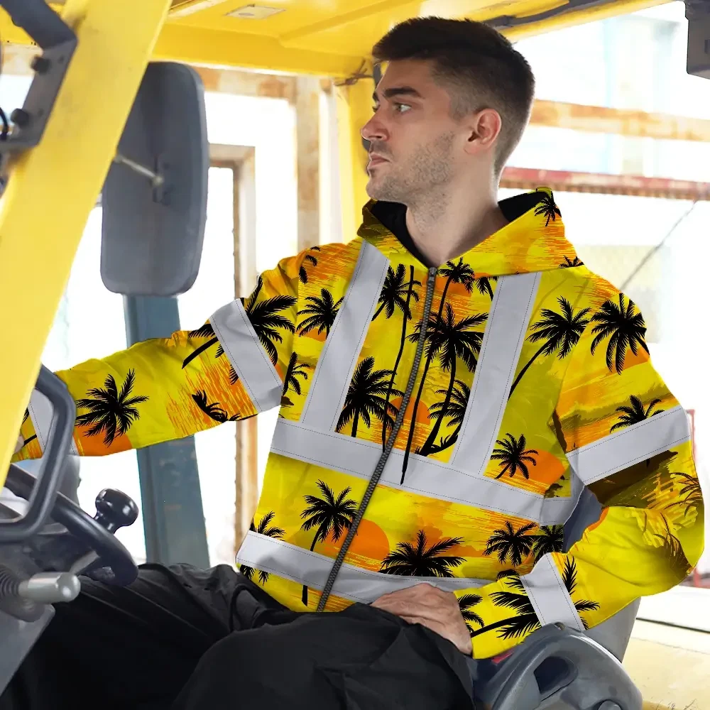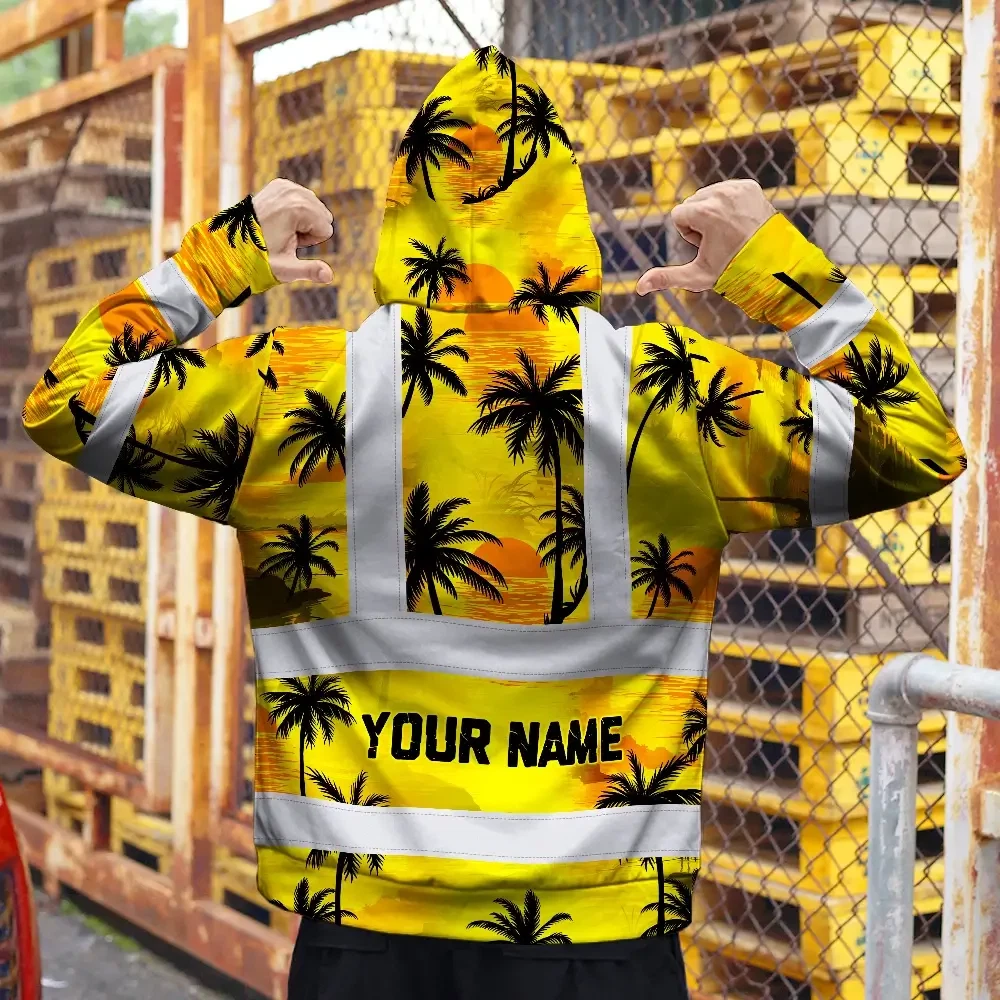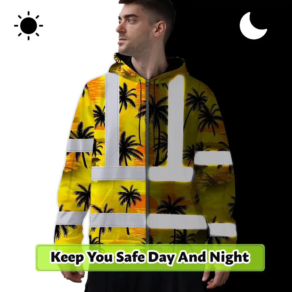 Hi Vis Zip Hoodie Reflective Tapes Yellow Neon Flowers Custom Name Safety Workwear For Workers, Truckers, Operators