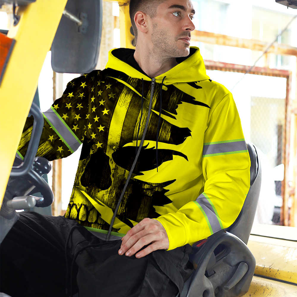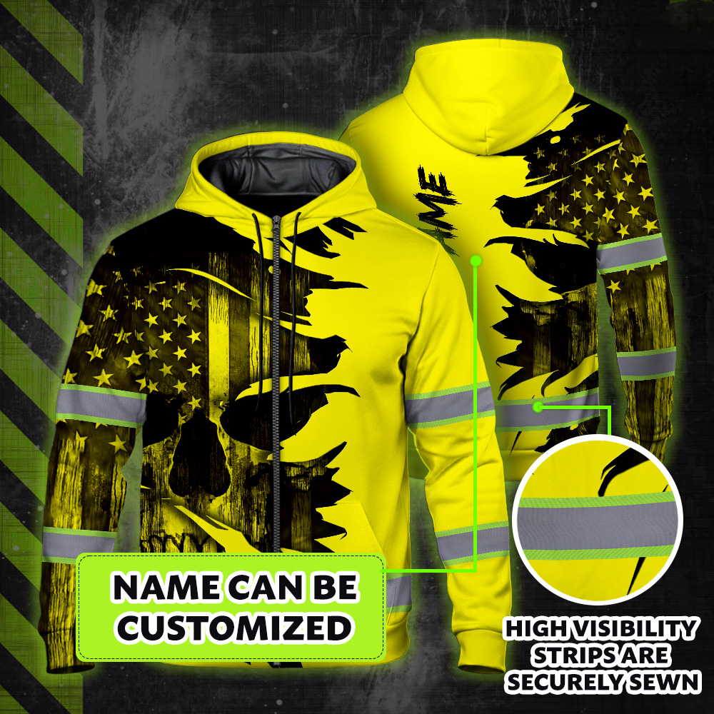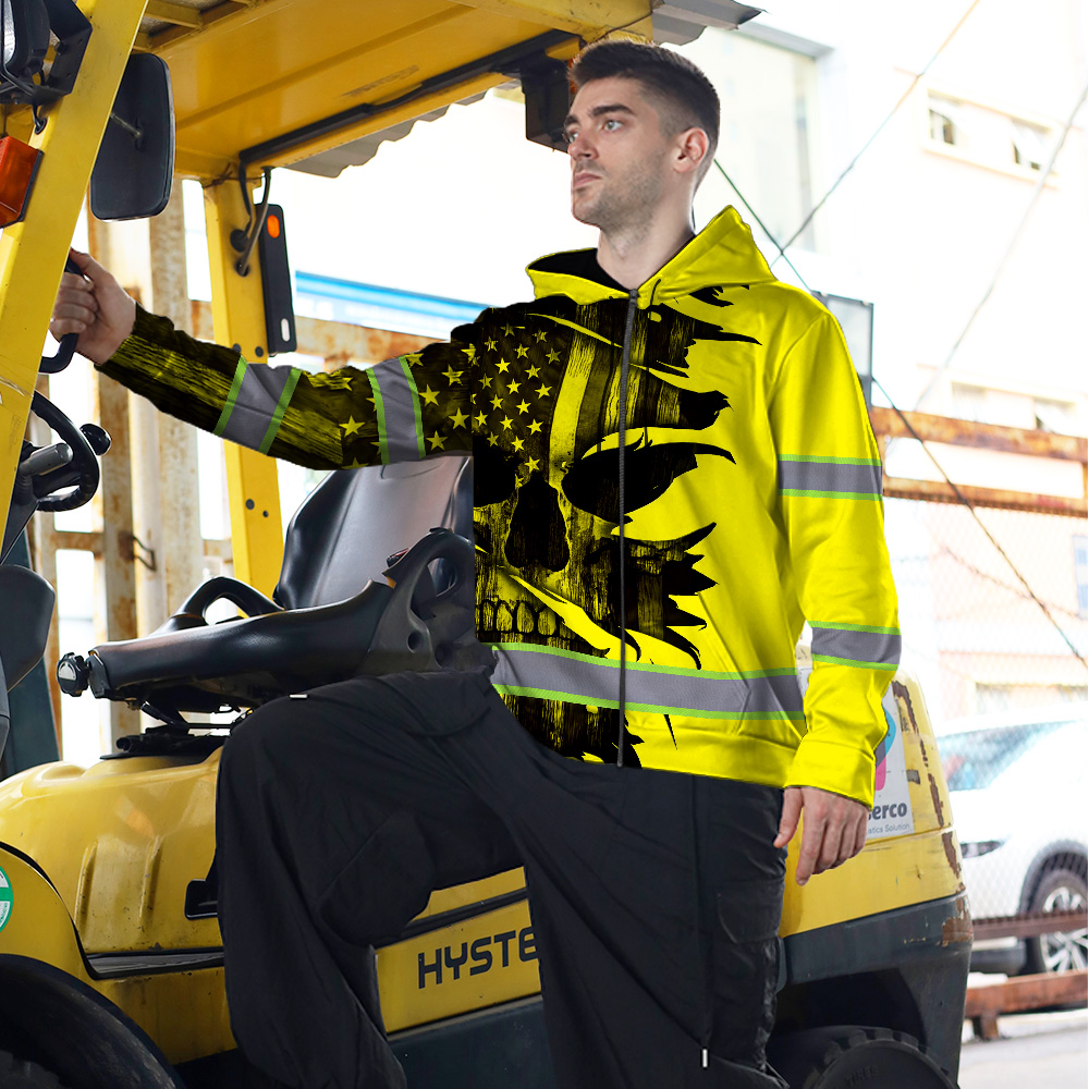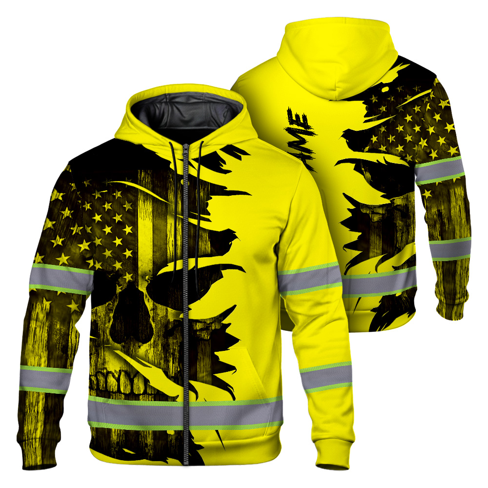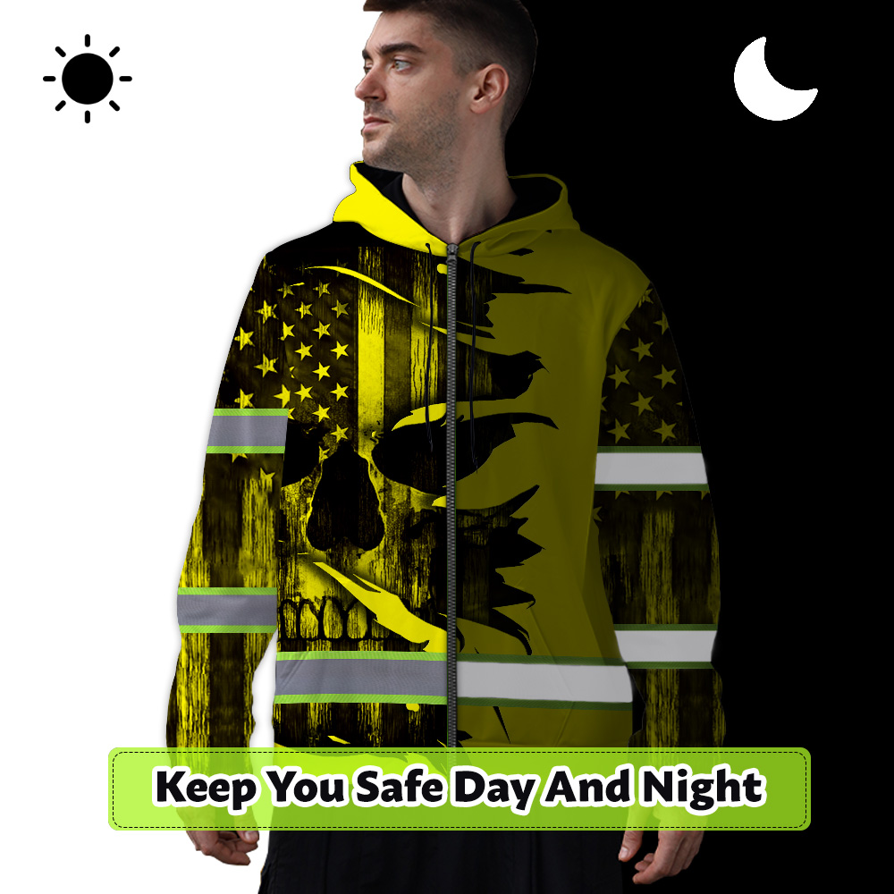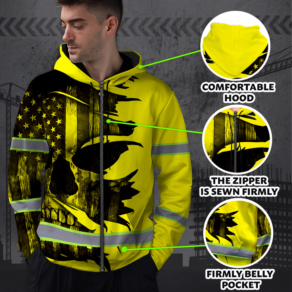 Hi Vis Zip Hoodie Reflective Tapes Yellow Neon Skull US Flag Scratch