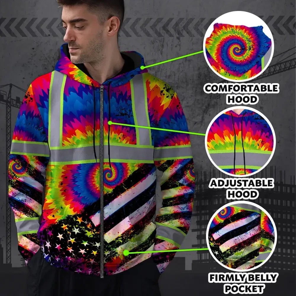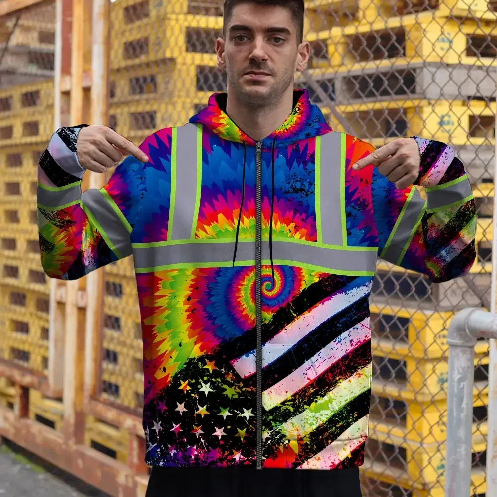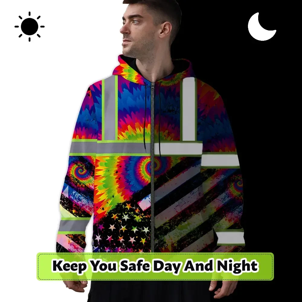 Hi Vis Zip Hoodie Reflective Tie Dye US Flag Paint Custom Name Safety Workwear For Worker, Motorcycle Bicycle, Runner