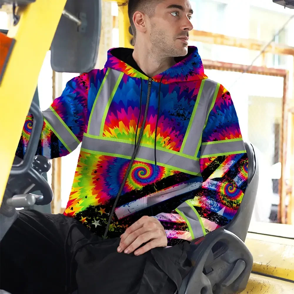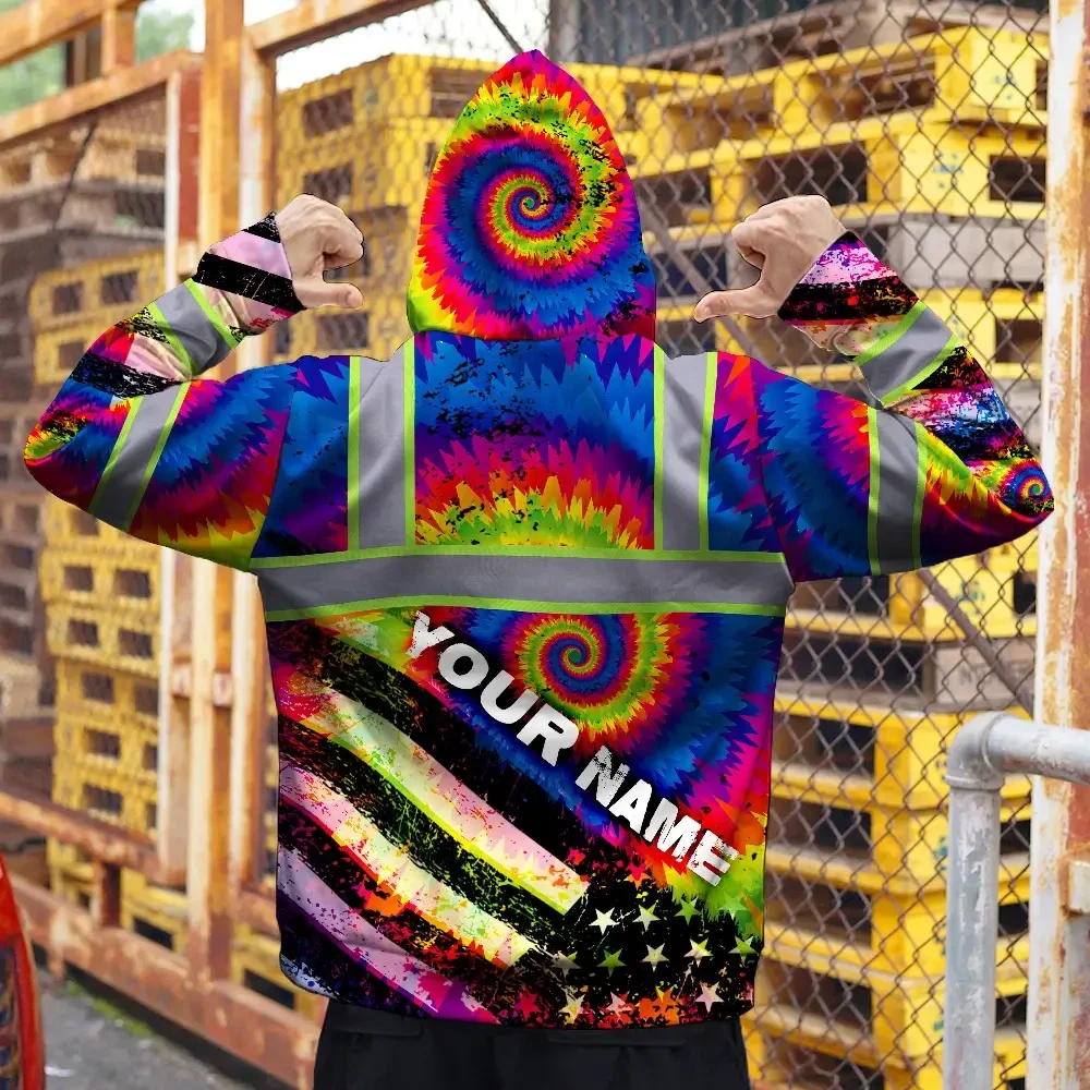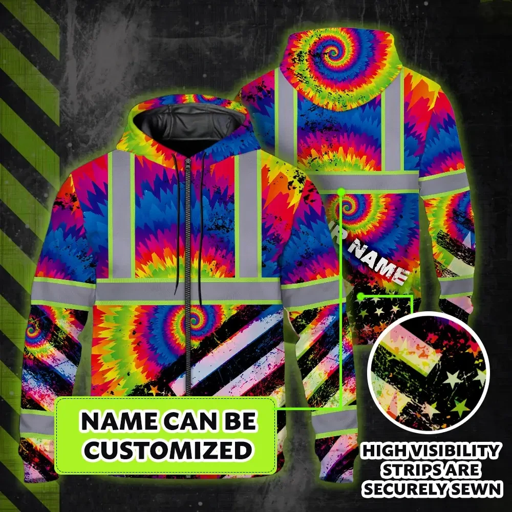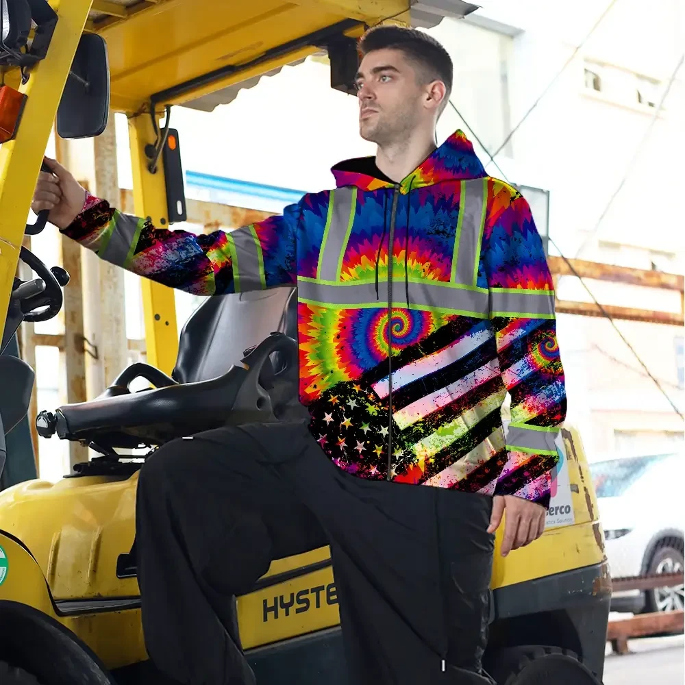 Hi Vis Zip Hoodie Reflective Tie Dye US Flag Paint Custom Name Safety Workwear For Worker, Motorcycle Bicycle, Runner