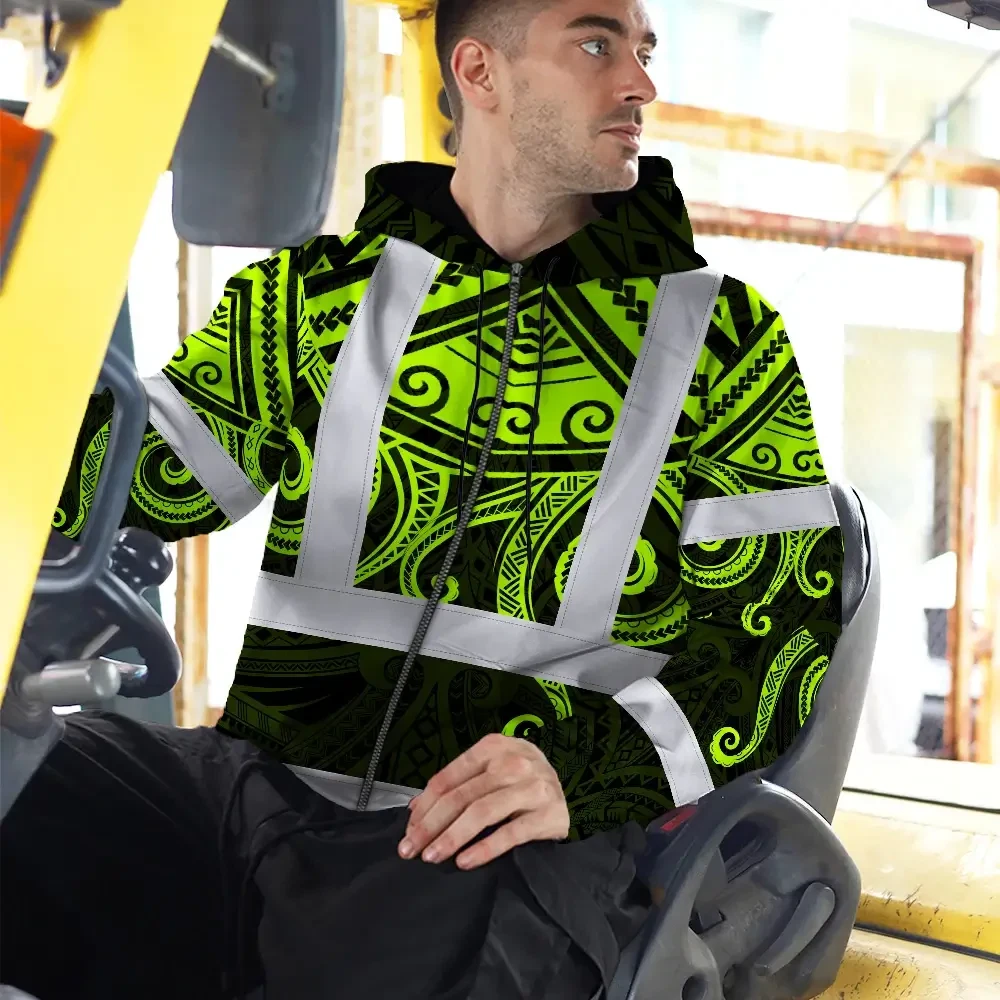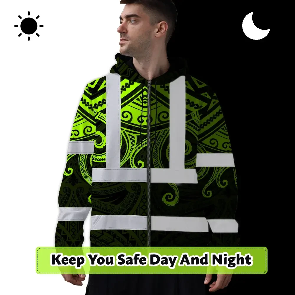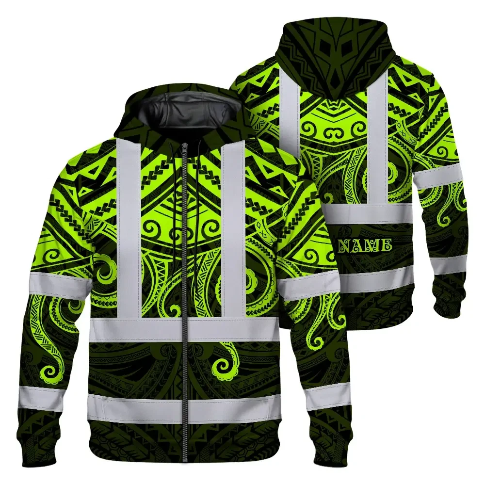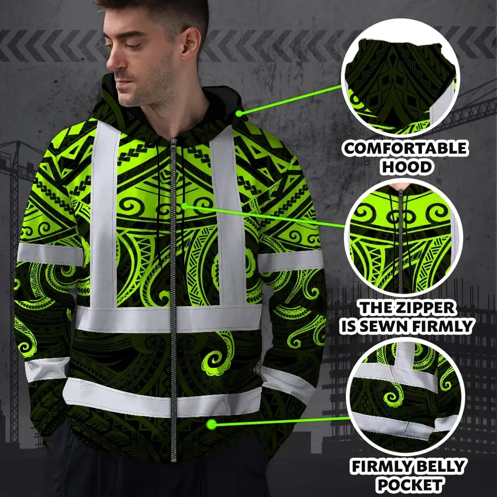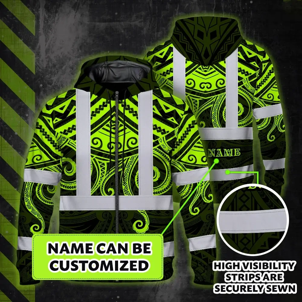 Hi Vis Zip Hoodie Shirt Reflective Tapes Octopus Hawaiian Polynesian Tribal Custom Name Safety Workwear For Workers, Truckers, Operators