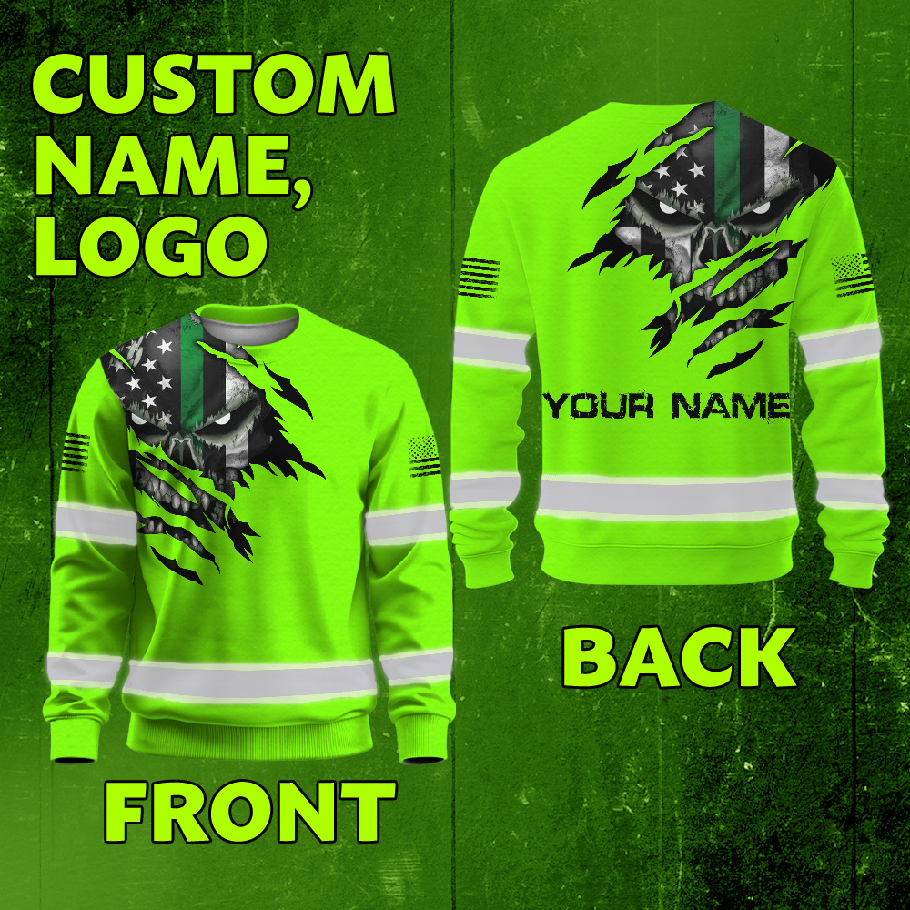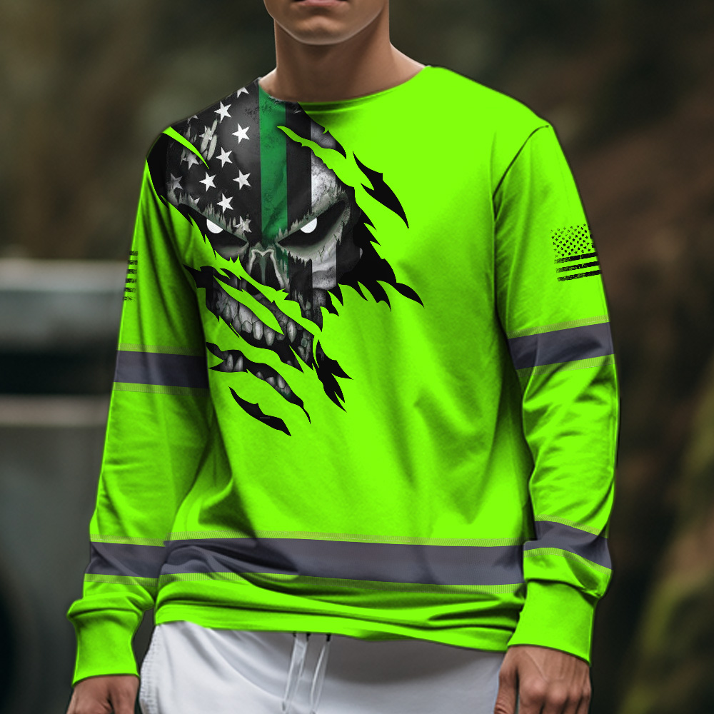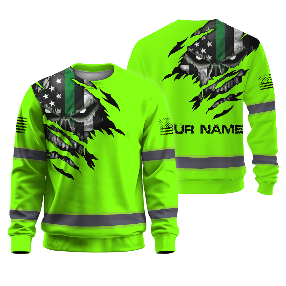 High Visibility Long Sleeve Shirt Green Skull US Flag Custom Name Reflective Safety Workwear For Runners, Truckers, Skull Lovers