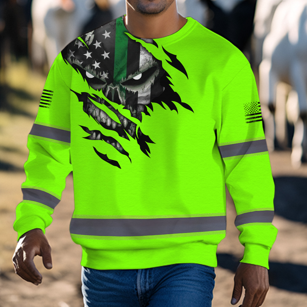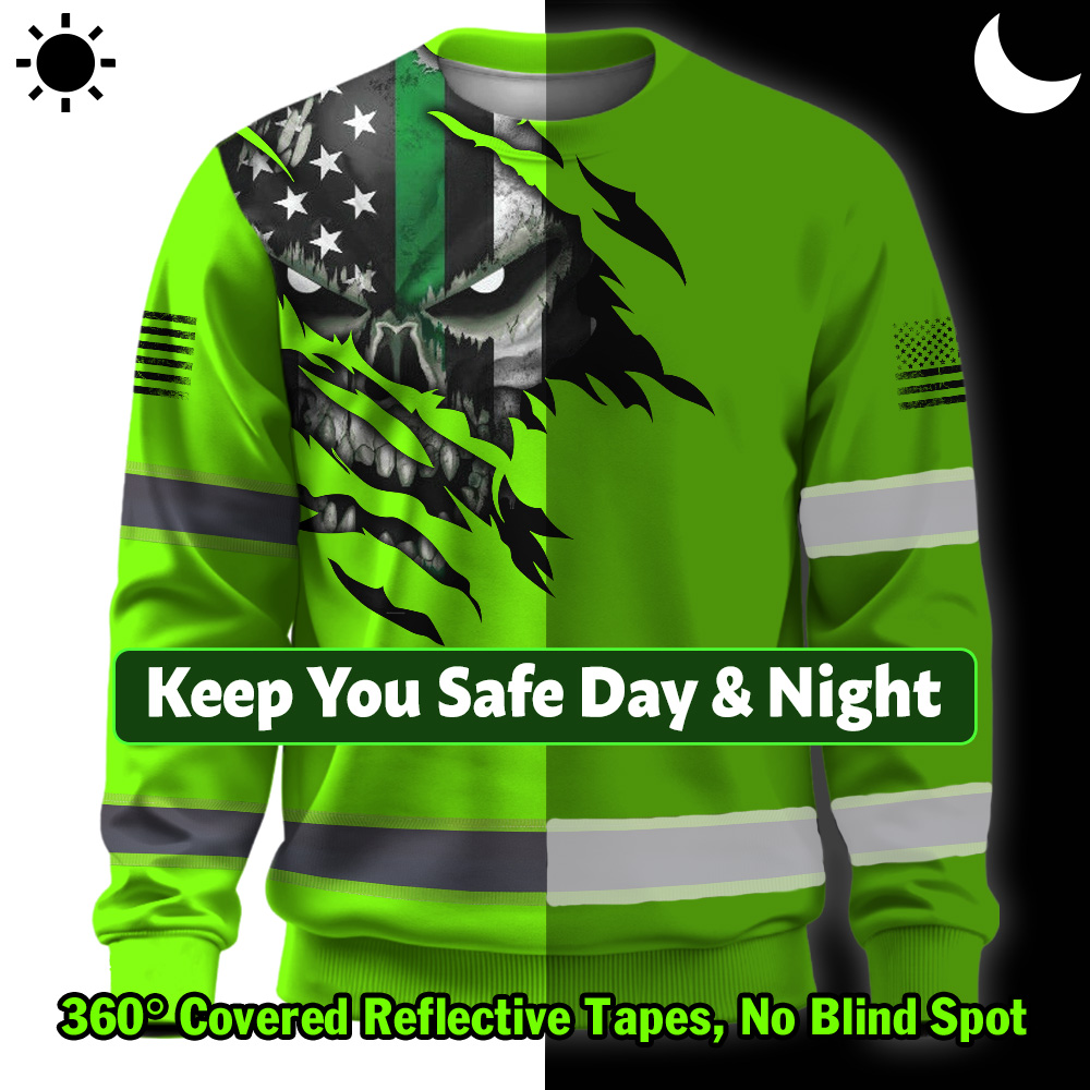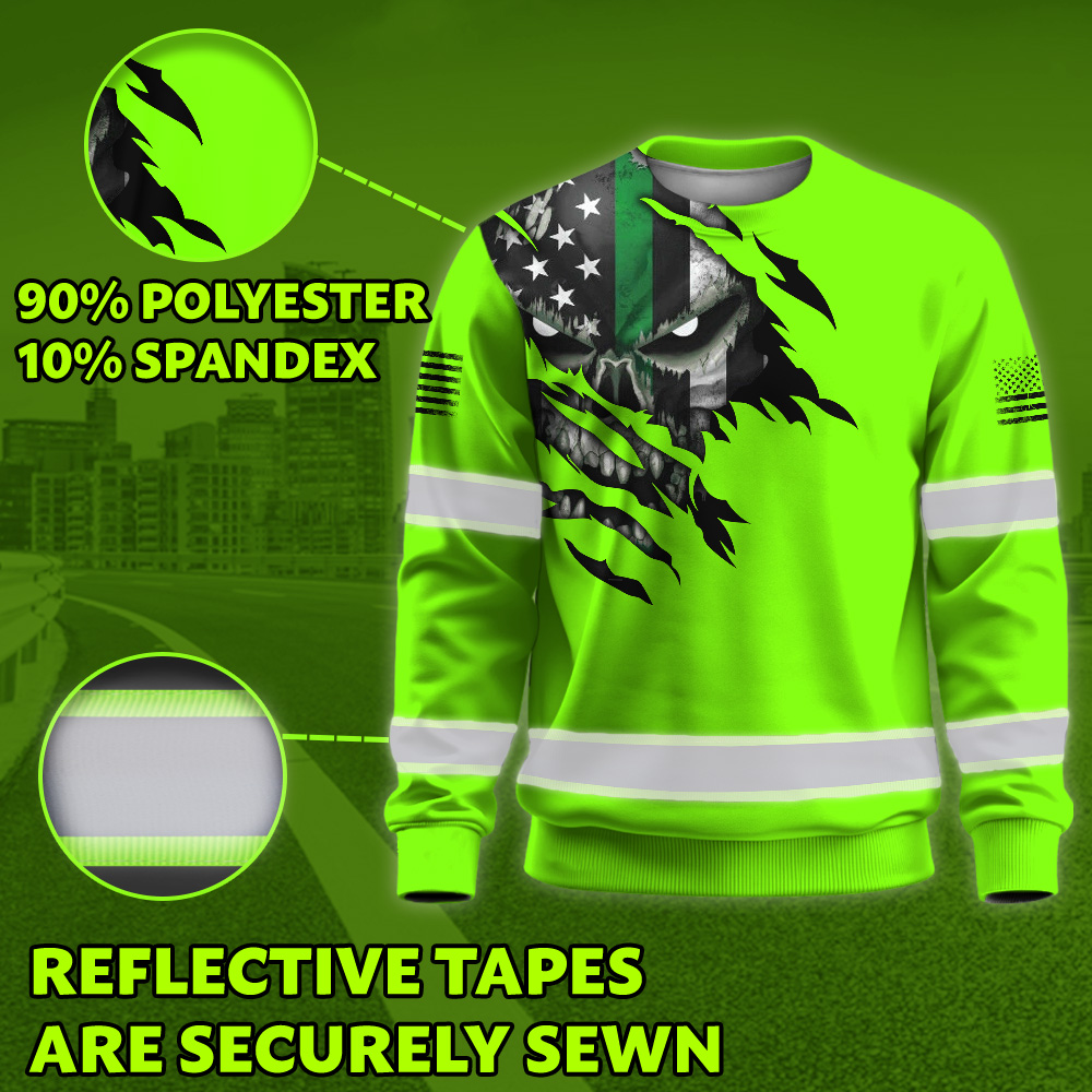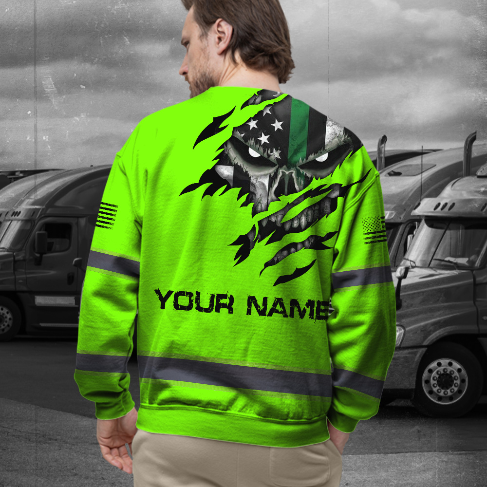 High Visibility Long Sleeve Shirt Green Skull US Flag Custom Name Reflective Safety Workwear For Runners, Truckers, Skull Lovers