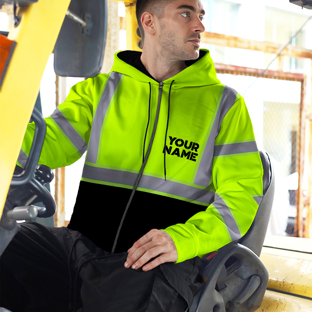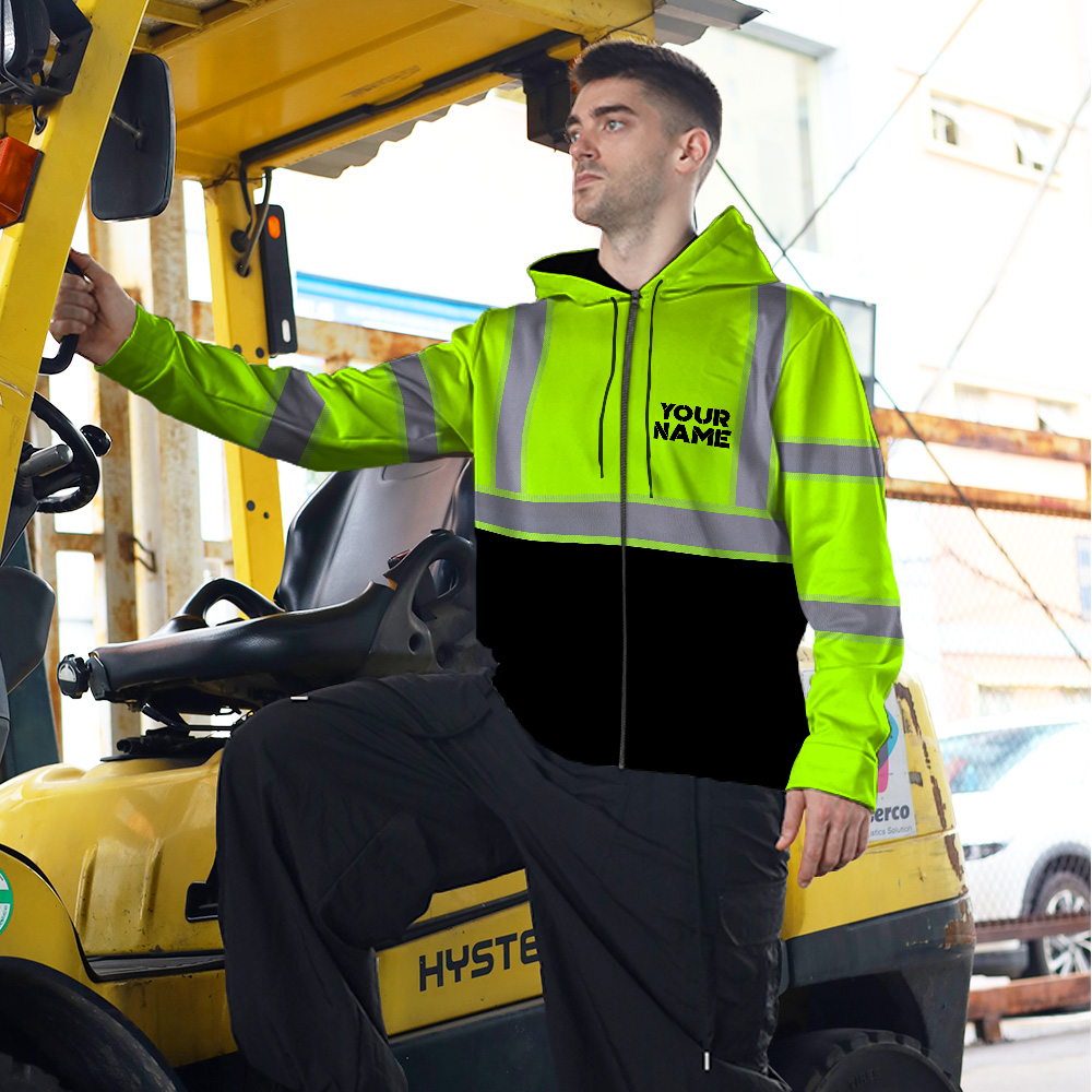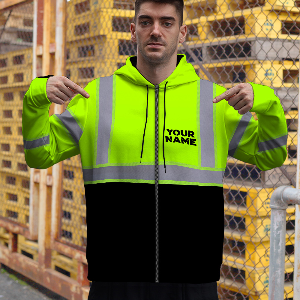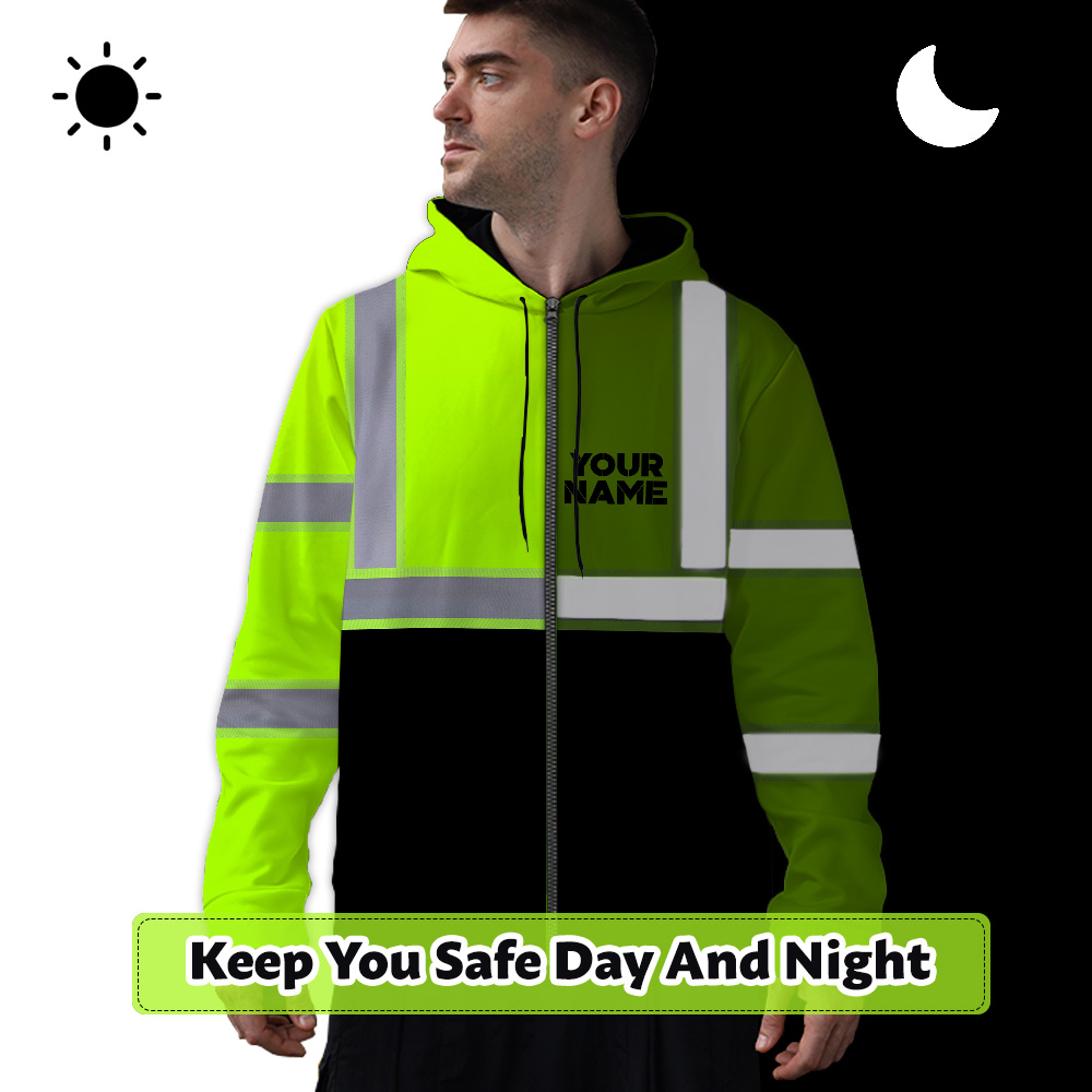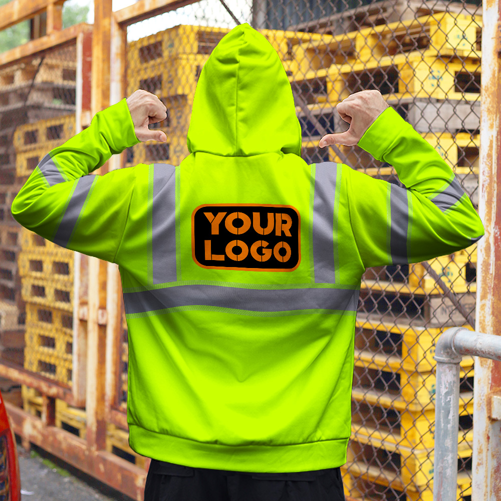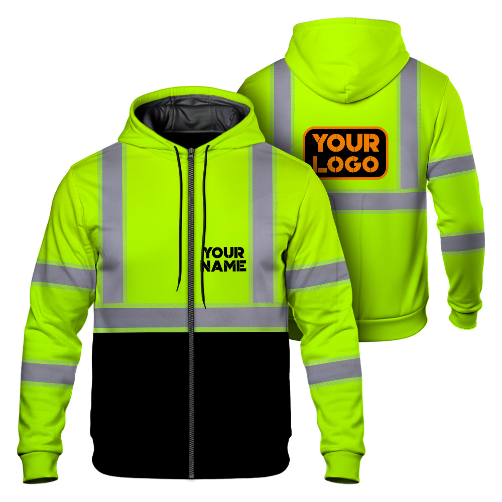 A high visibility zip hoodie reflective green custom name and logo safety workwear is a type of clothing that is specifically designed to improve the visibility of the wearer in low-light or dark conditions. The reflectivity of the fabric helps to reflect light back to the source, making the wearer more visible. This can be especially important in situations where there is a risk of being struck by a vehicle, such as when working on or near a roadway. High visibility clothing is often required by law in certain professions, such as law enforcement, construction, and transportation. In addition to Reflective Security Jacket there are other types of reflective clothing available that can also improve visibility, such as reflective vests and hats.