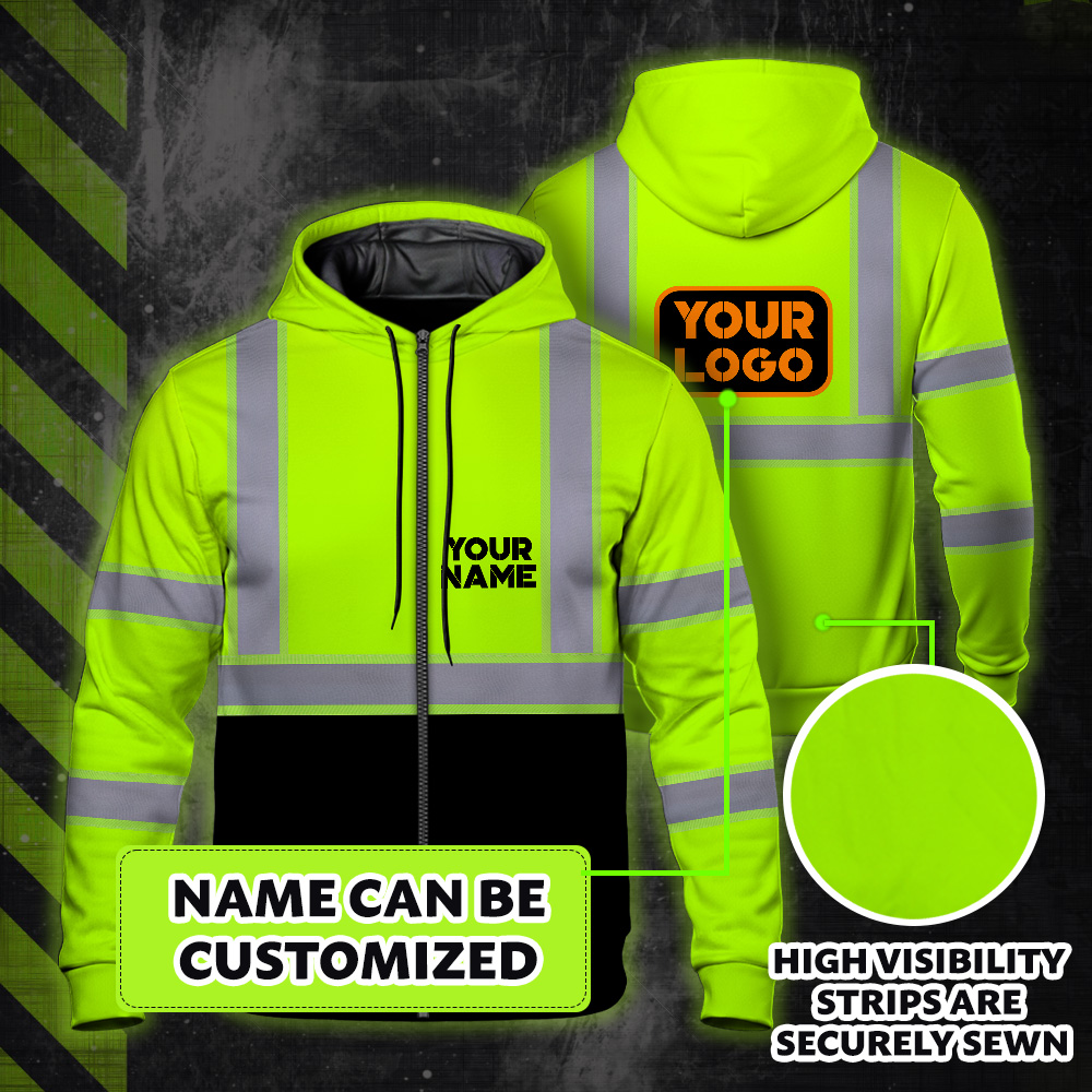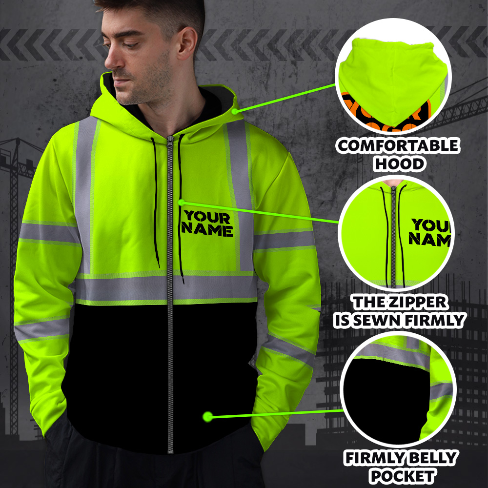 High Visibility Zip Hoodie Reflective Green Custom Name and Logo Safety Workwear Key Features