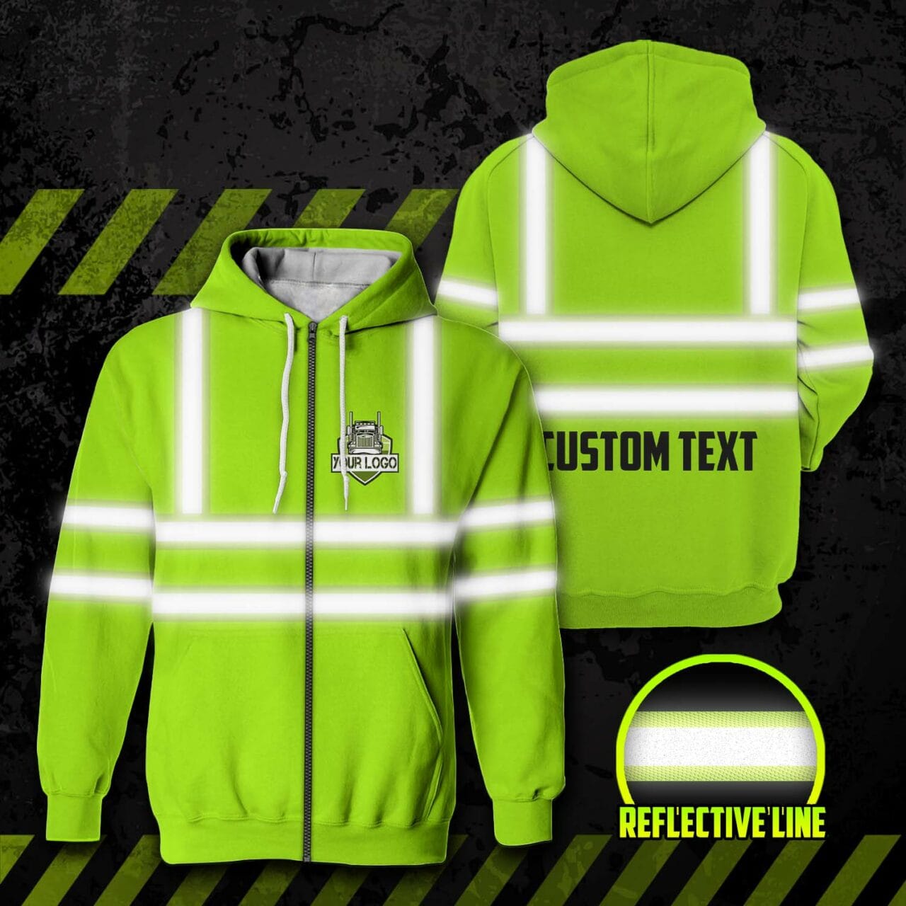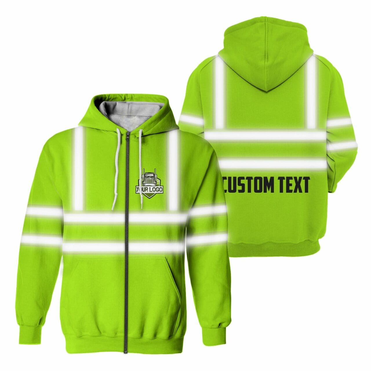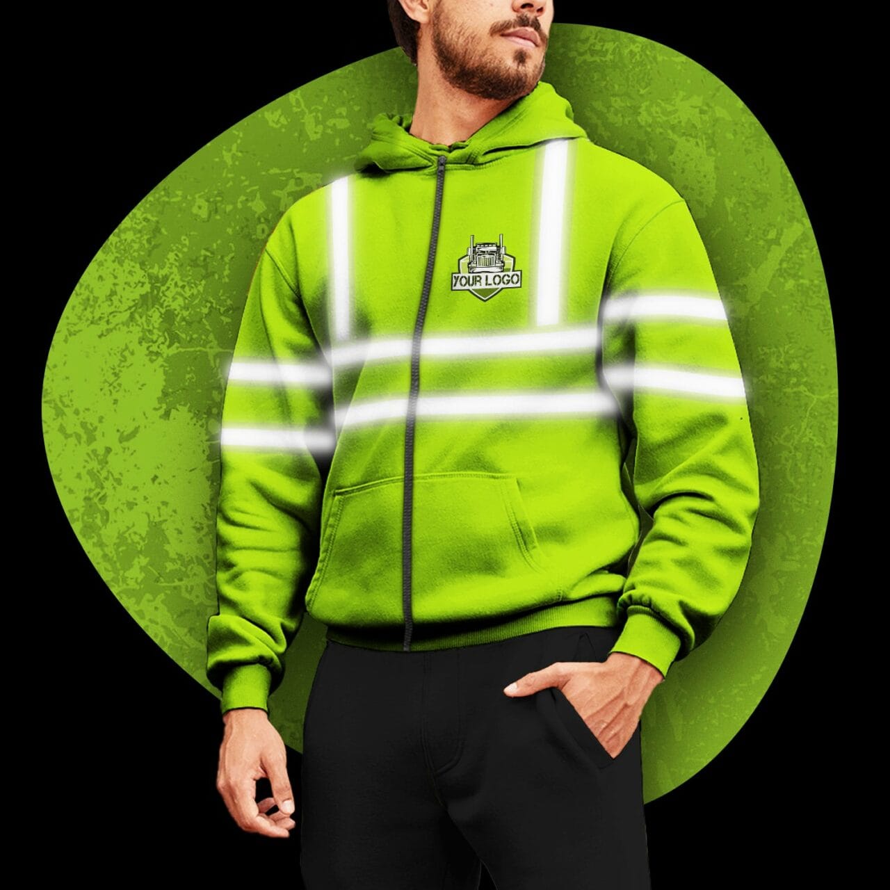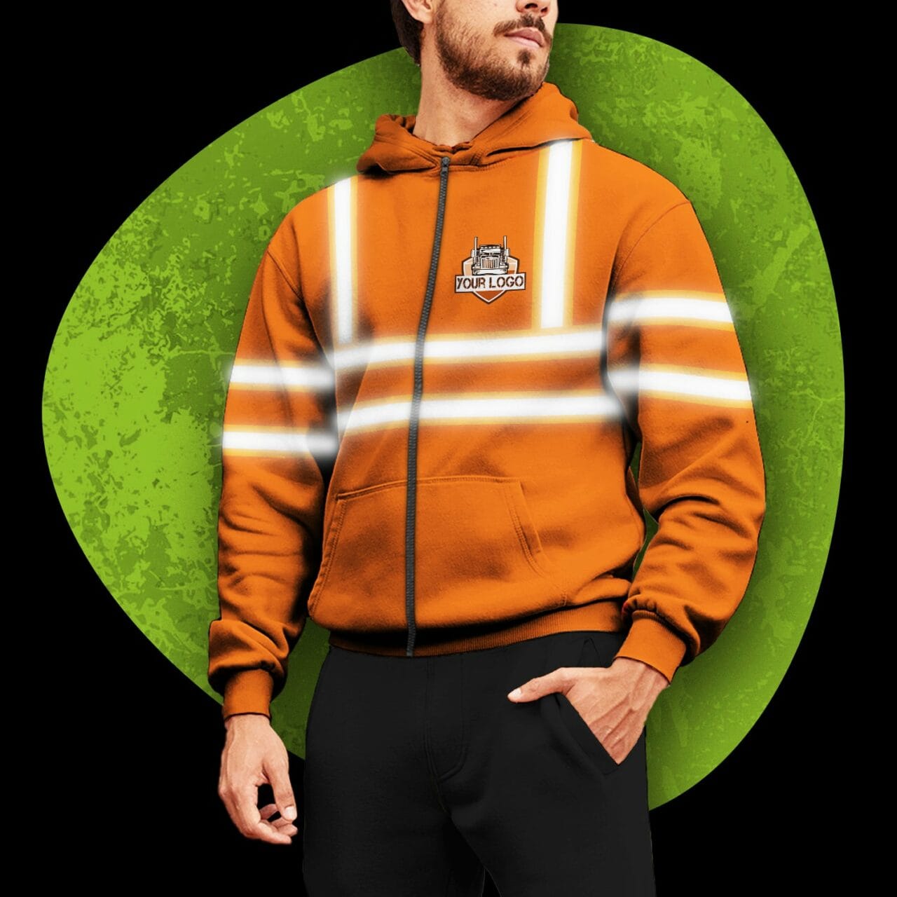 If you’re looking for a reliable and high-quality high visibility zip hoodie, then look no further than our reflective green orange black custom name safety work zip hoodie. Our zip hoodies are made of polyester and feature a comfortable relaxed fit. They’re also perfect for layering in colder weather. Plus, they include two front pockets and a drawstring hood. Best of all, they can be customized with your name or logo.
