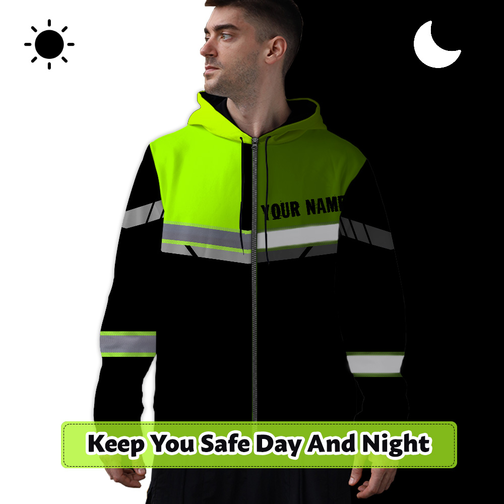 Custom Name High Visibility Zip Hoodie Reflective Workwear is the perfect way to stay safe and stylish on the job. This hi-vis hoodie is made with polyester fabric that is both durable and breathable. The fabric is also treated with a water-repellent finish, making it ideal for working in wet or humid conditions. The reflective logo and trim help to increase visibility in low-light conditions, while the zip front closure ensures a secure fit. Plus, the hoodie includes a built-in pencil pocket and an interior cell phone pocket, making it perfect for carrying essential work supplies. Whether you’re looking for safety gear or everyday apparel, Custom Name High Visibility Zip Hoodie Reflective Workwear is a great choice.
