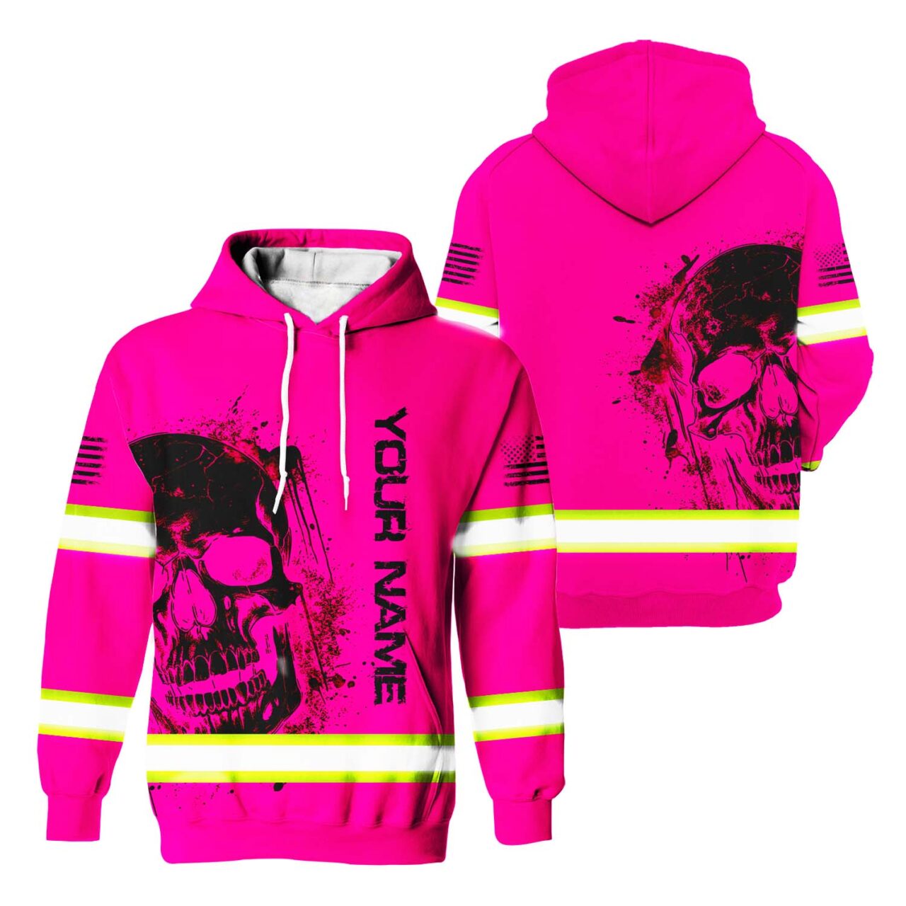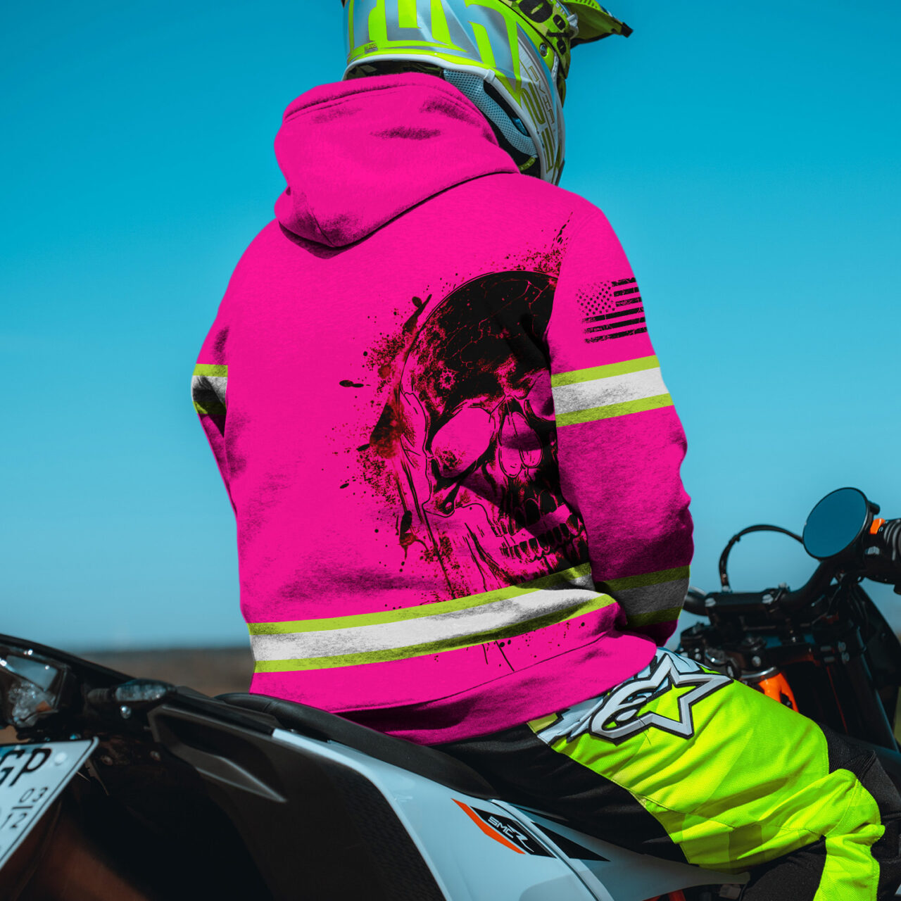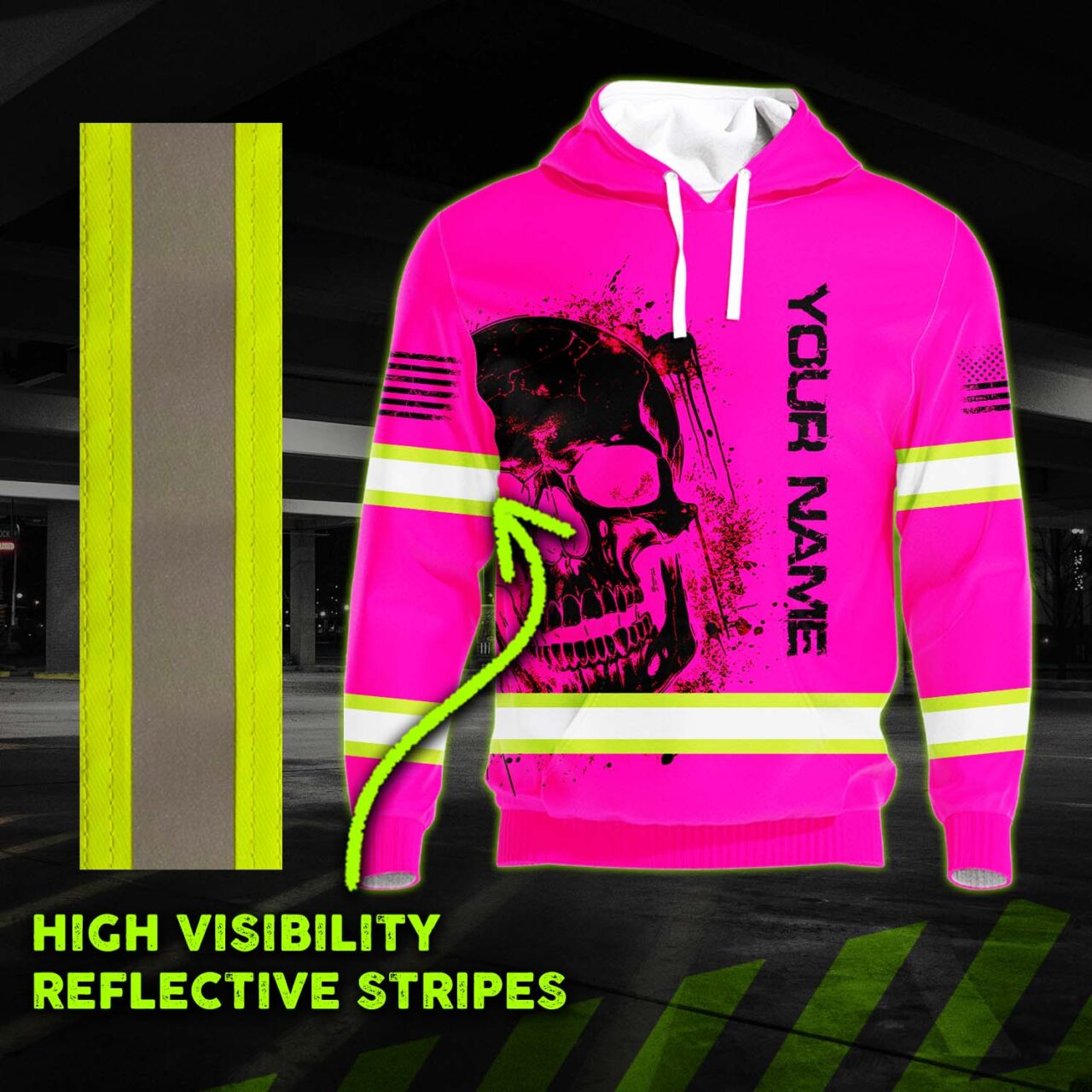 Pink Reflective Hoodie Tapes Pink Neon Skull And Flag Custom Name Safety Workwear For Workers, Runners, Cyclists