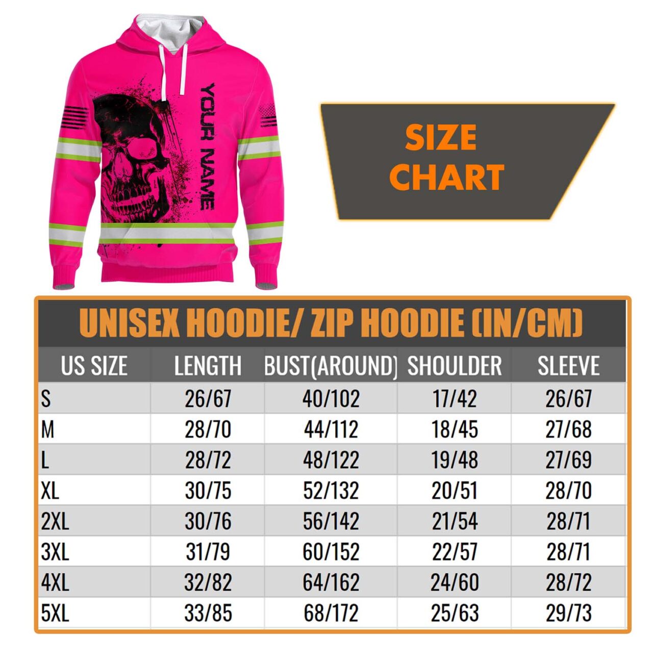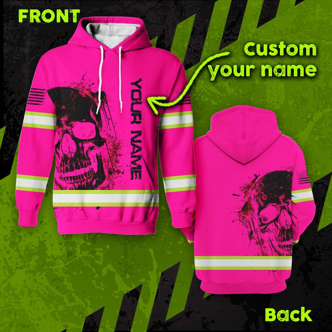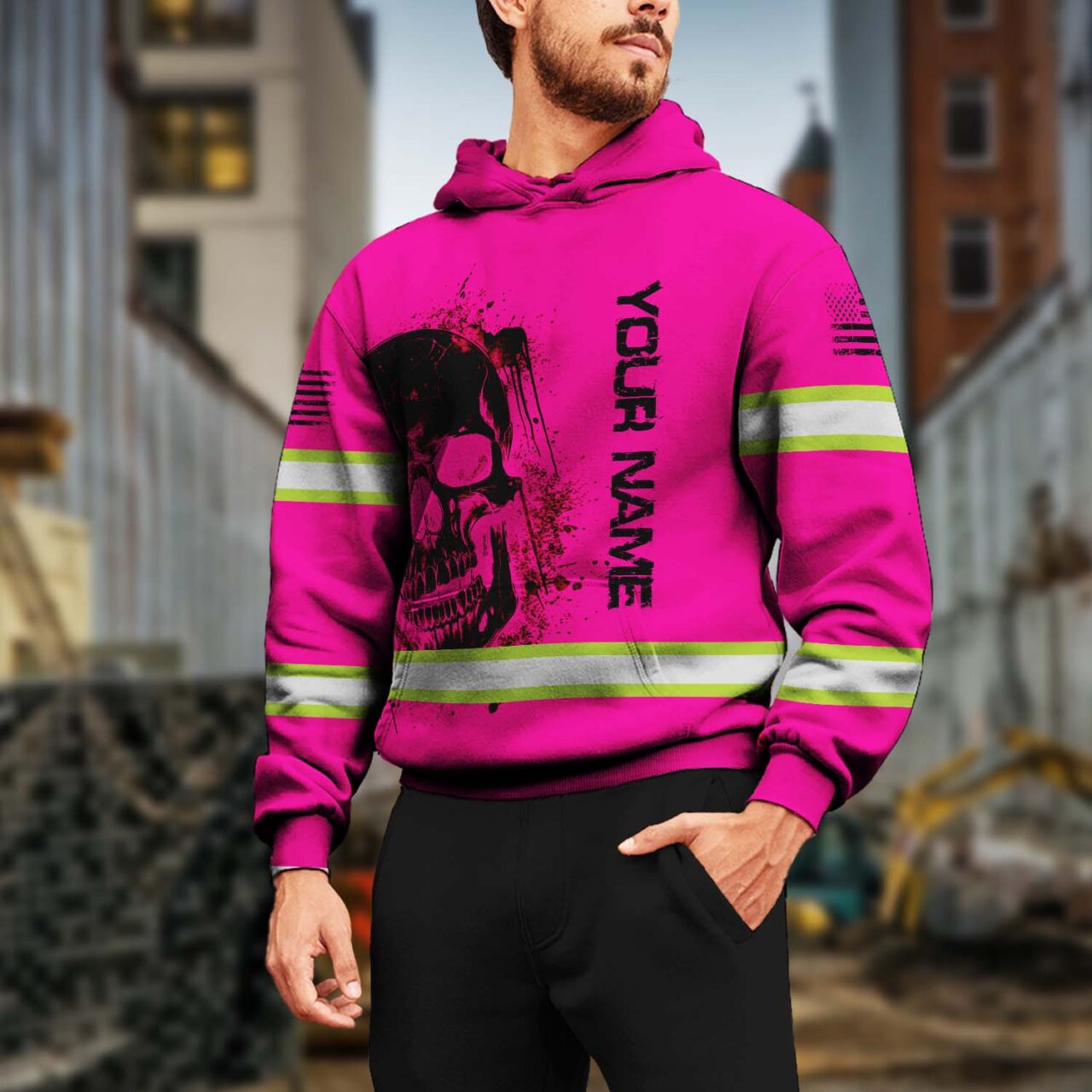 Pink Reflective Hoodie Tapes Pink Neon Skull And Flag Custom Name Safety Workwear For Workers, Runners, Cyclists