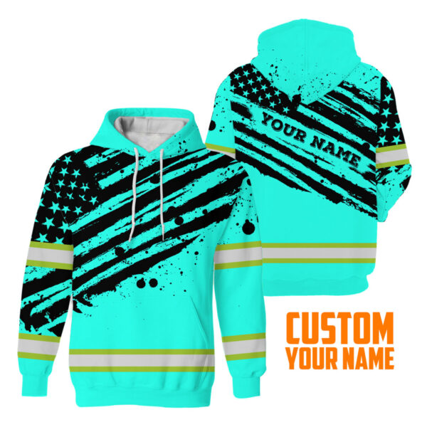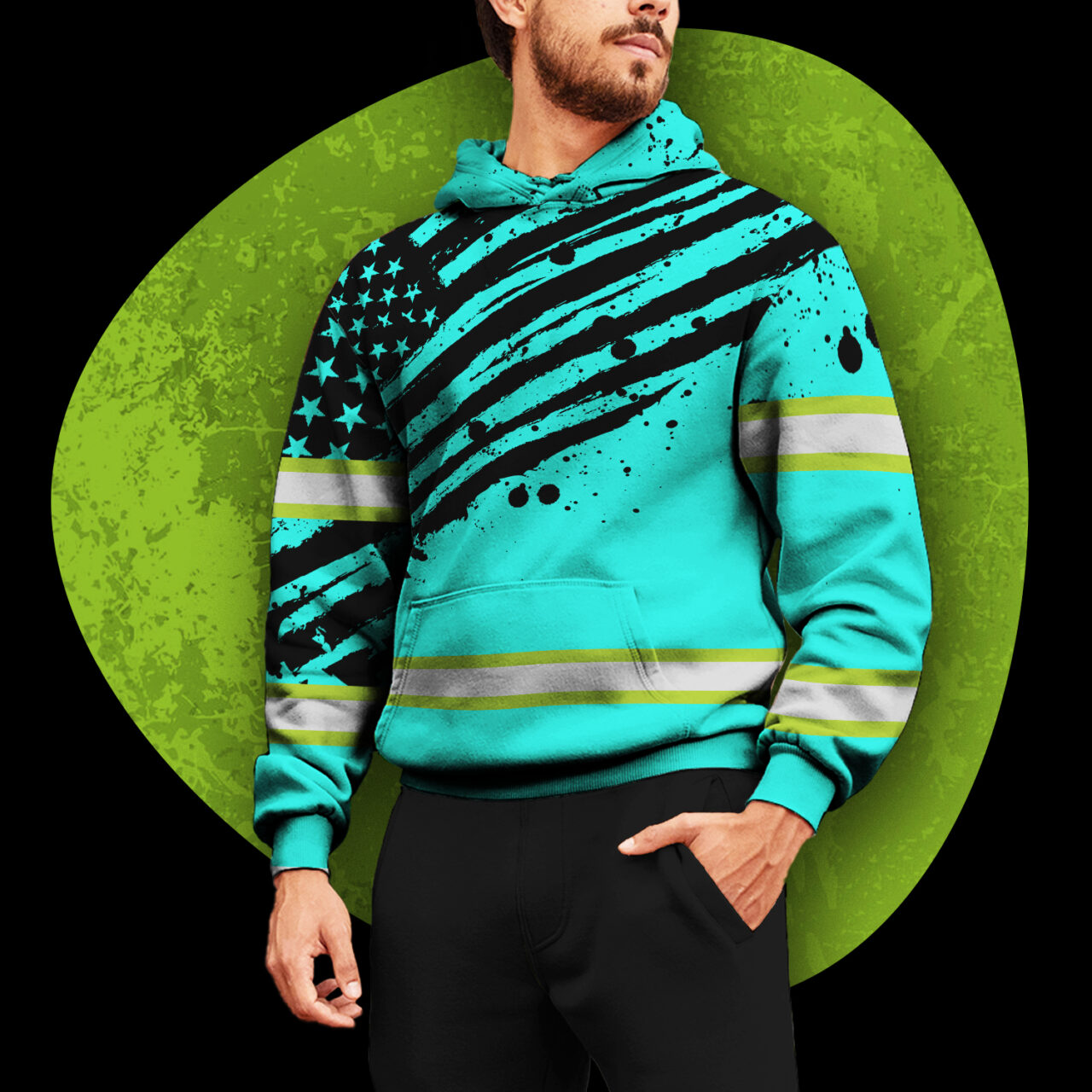 Hi Vis Hoodie Reflective Tapes Mint US Flag Custom Name Safety Workwear For Workers, Runners, Cyclists, Patriotic, Truckers