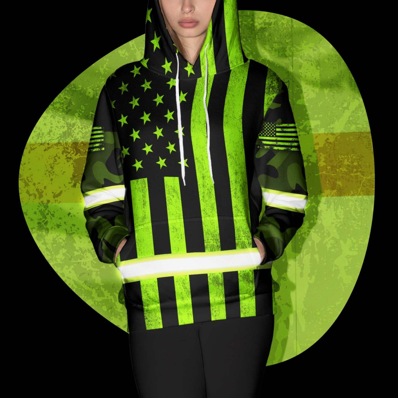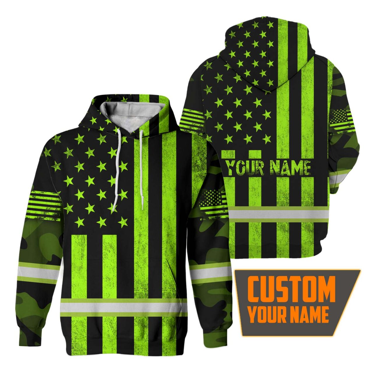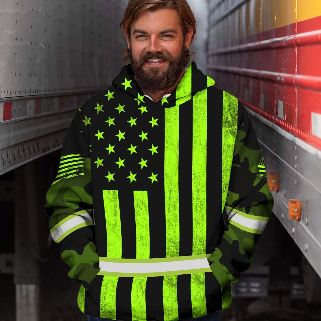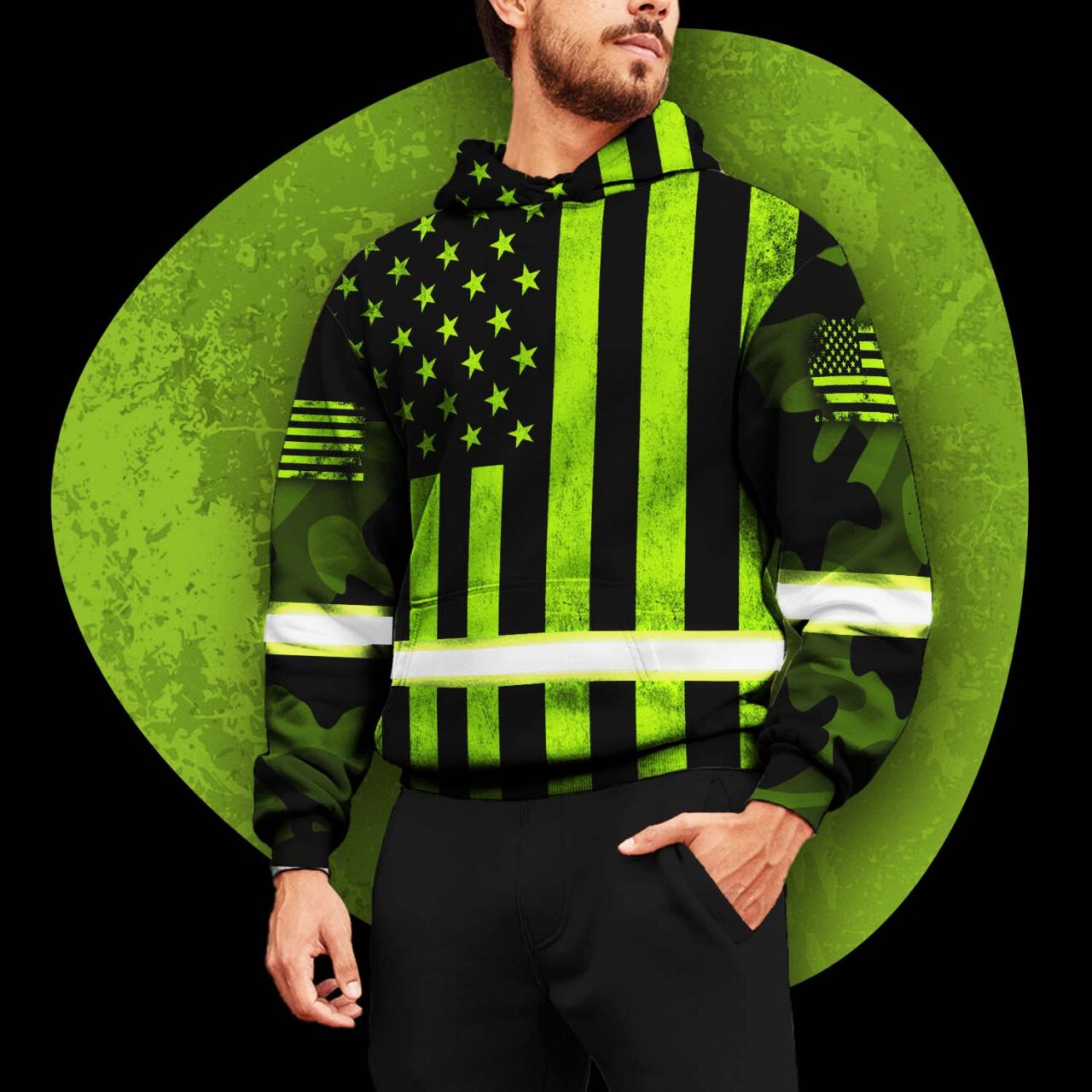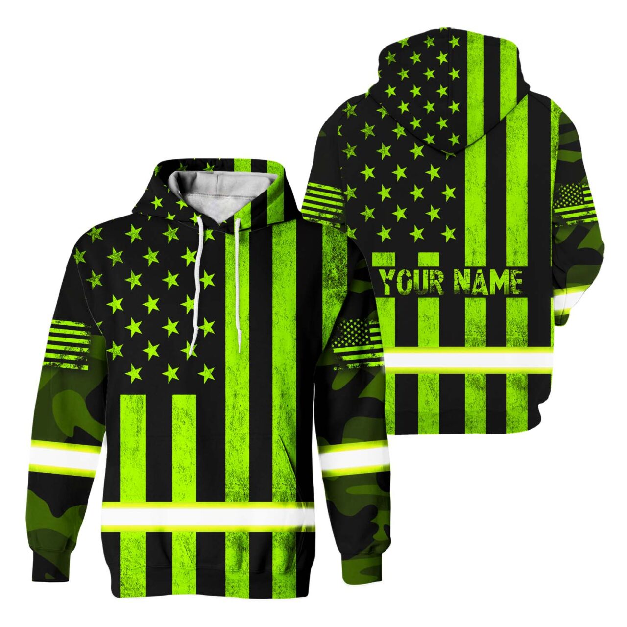 Safety Hoodies For Men Green Neon USA Flag Custom Name Safety Workwear For Worker, Operator, Trucker