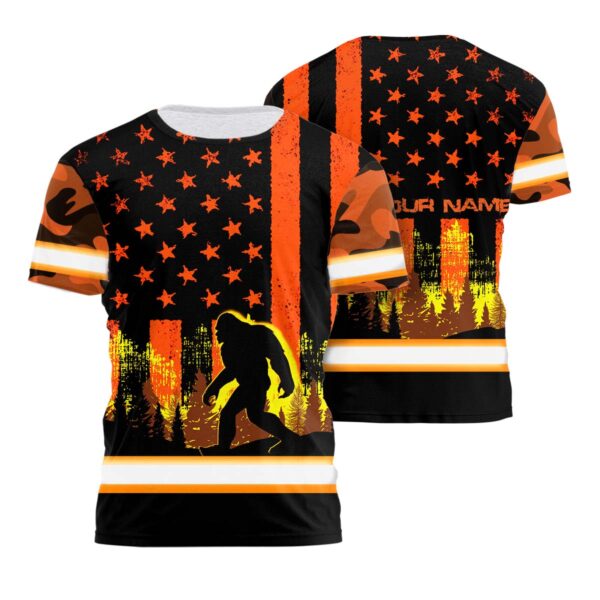 Hi Vis Shirt Reflective Orange USA Flag With BigFoot Custom Name Safety Workwear For Workers, Runners, Cyclists, Patriotic Description