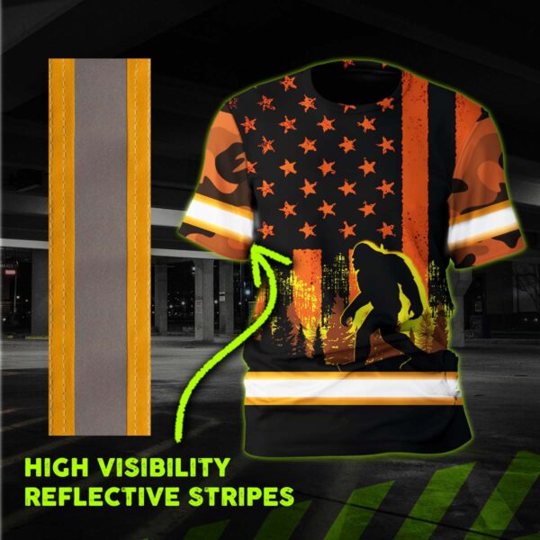 Hi Vis Shirt Reflective Orange USA Flag With BigFoot Custom Name Safety Workwear For Workers, Runners, Cyclists, Patriotic Key Features