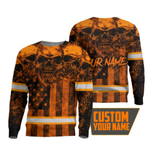 Hi Vis Long Sleeve Shirt Reflective Orange Skull US Flag Custom Name Safety Workwear